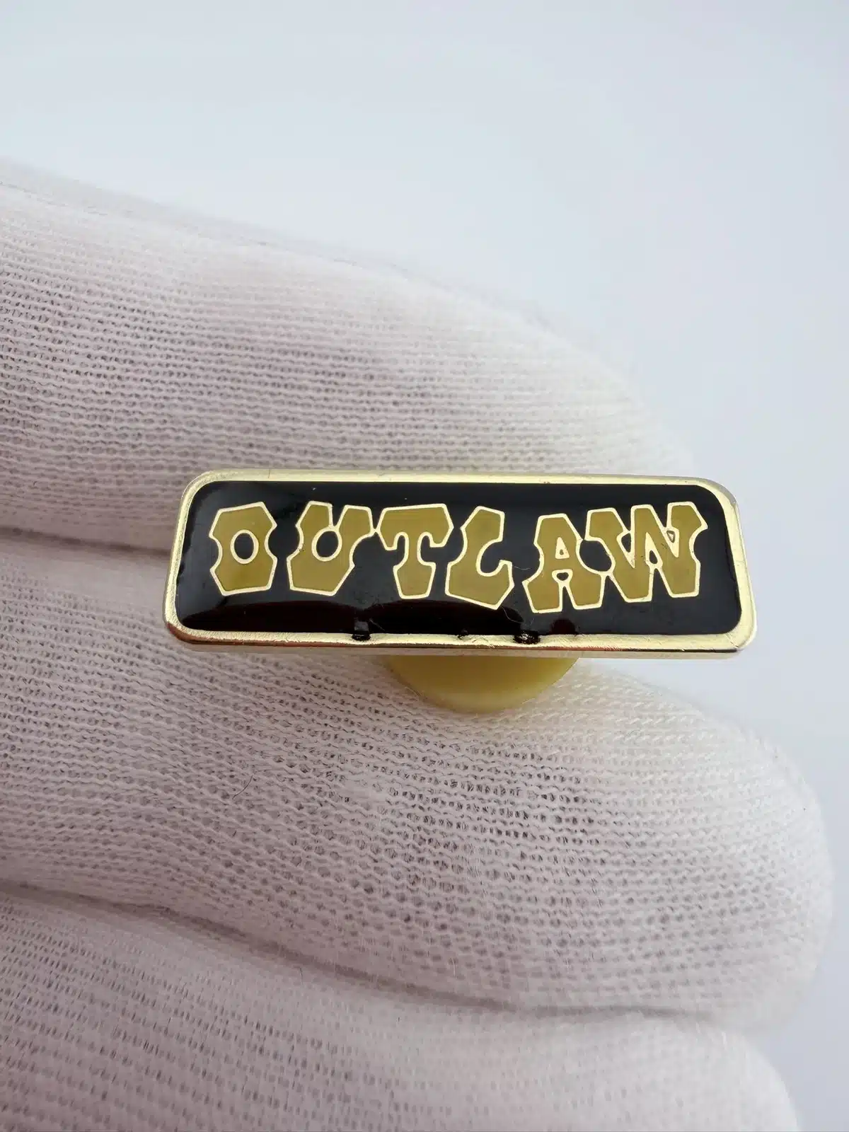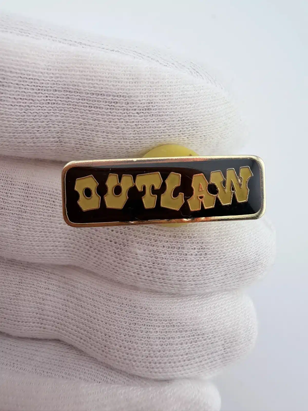 This Outlaw Lapel Hat Pin features bold Western-style lettering in faded yellow against a striking black background, capturing the rugged essence of the outlaw theme. The design evokes the spirit of the American West, where outlaws became legendary figures in folklore and popular culture.