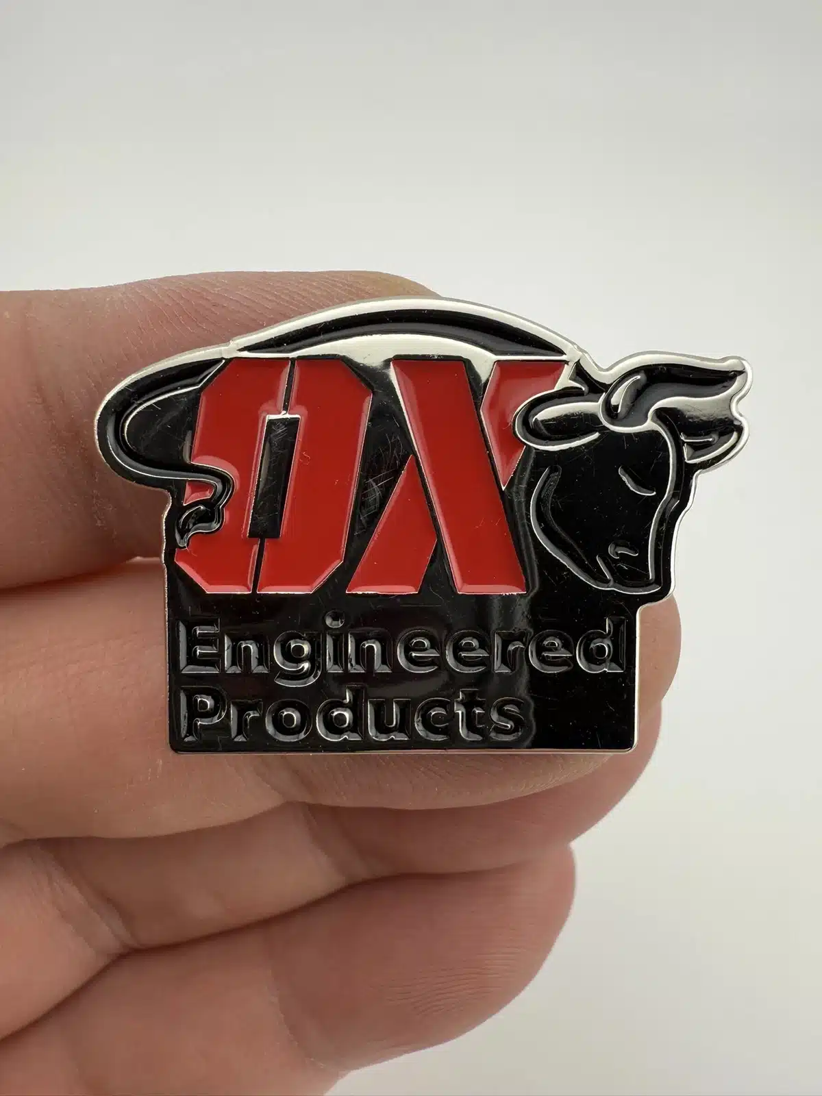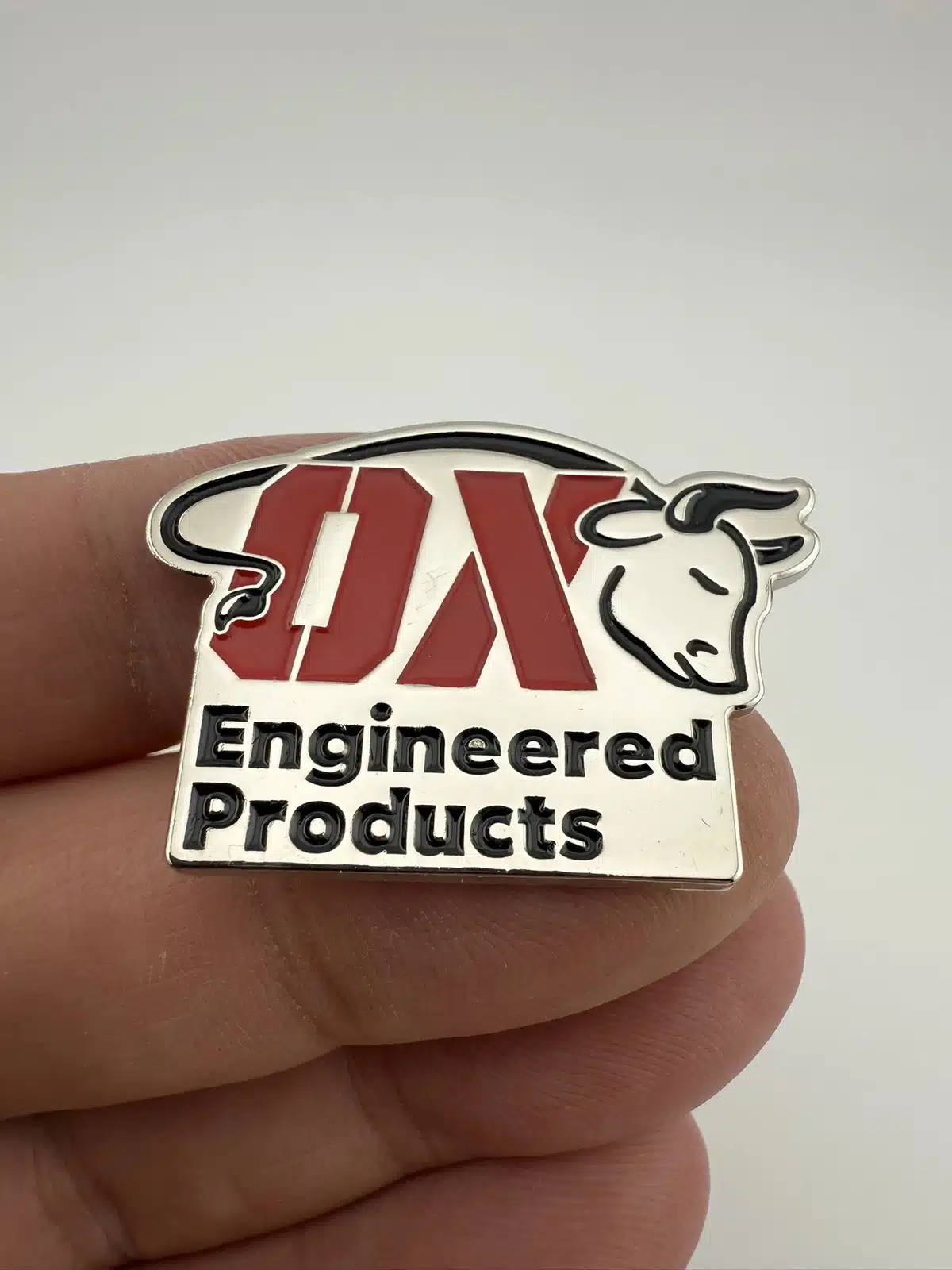 This lapel pin features the OX Engineered Products logo, showcasing a bold design that reflects the brand’s commitment to quality and innovation in weatherization products for home and business.