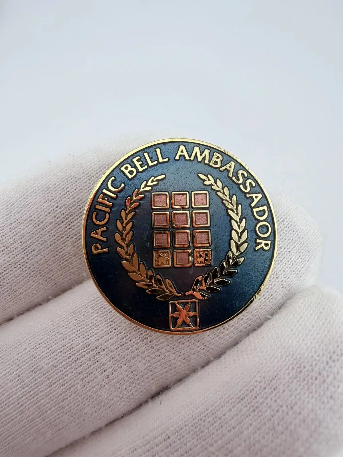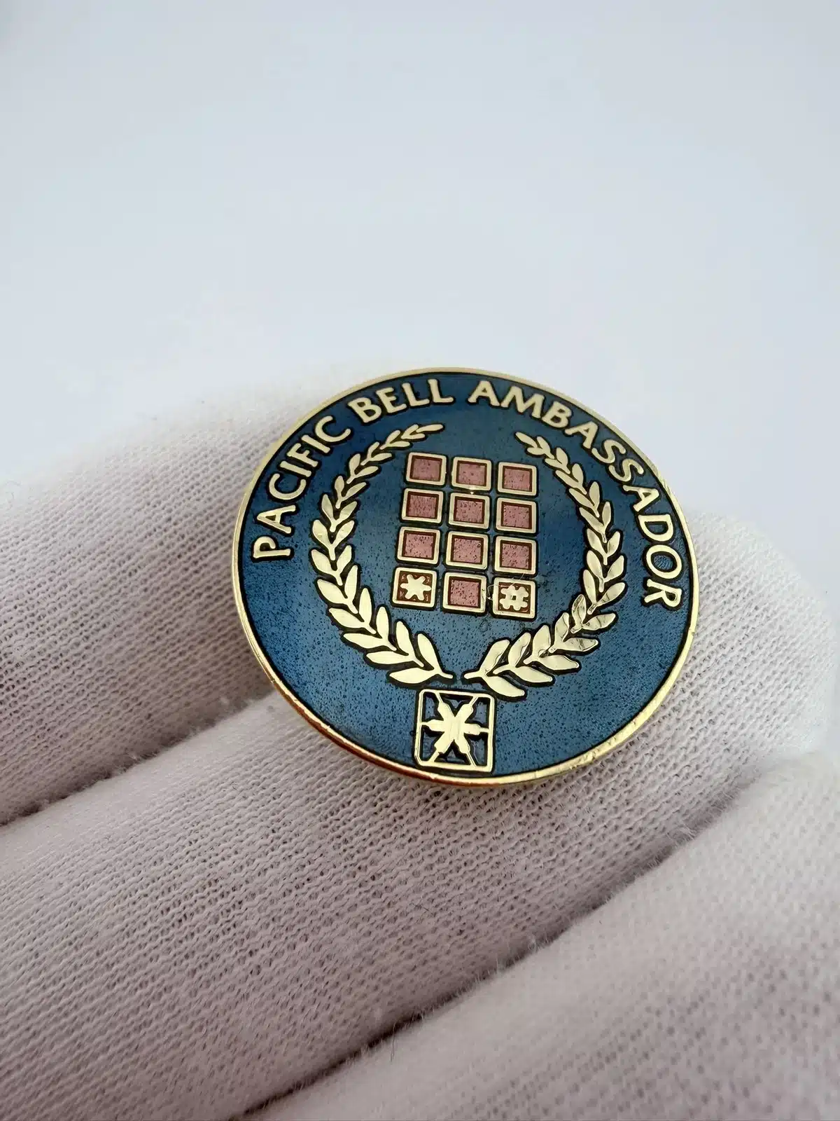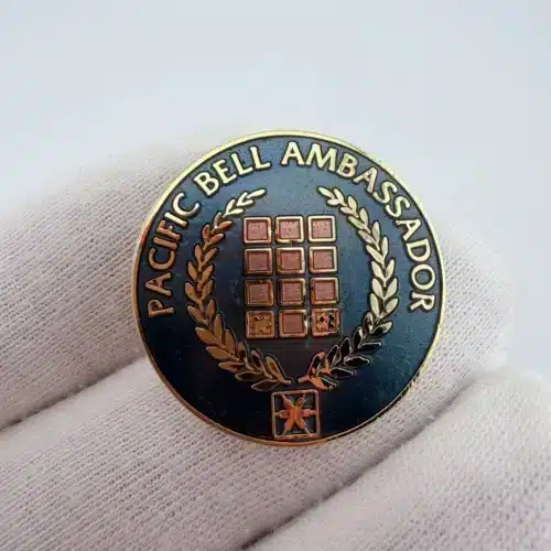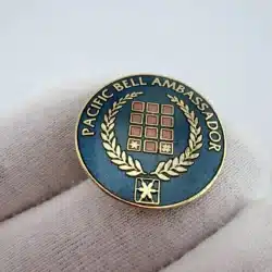 This beautiful circular enamel pin features the text ‘Pacific Bell Ambassador’ encircling a central design of a phone’s keypad, symbolizing the telecommunications industry. The laurel wreath wrapped around the keypad adds a touch of elegance, representing achievement and recognition within the company.