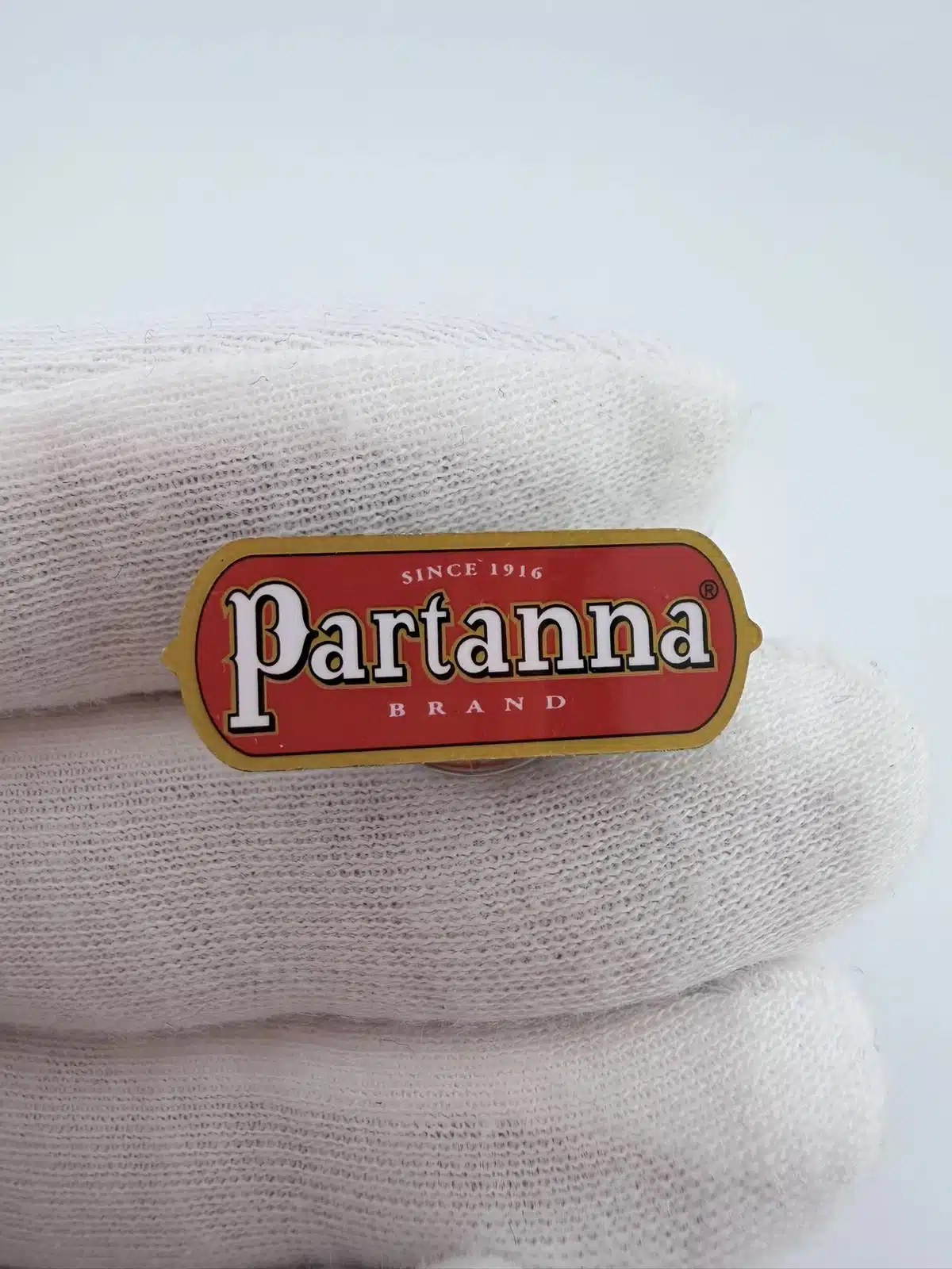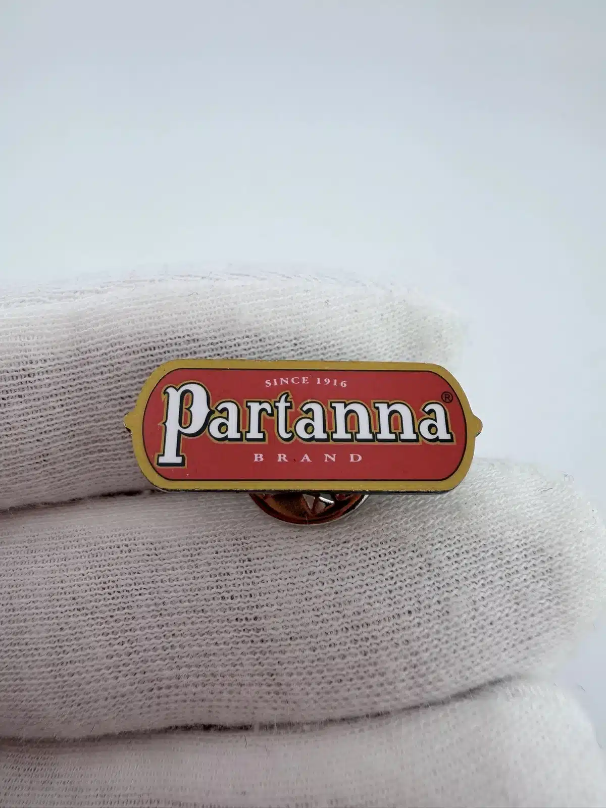 This Partanna Brand promotional pin features a simple text design referencing the Sicilian olive oil producer. The pin reads “Since 1916” above the word “Partanna” in white lettering, with “Brand” displayed below. Pin measures approximately 1 inch in width by just under 1/2 inches in height.