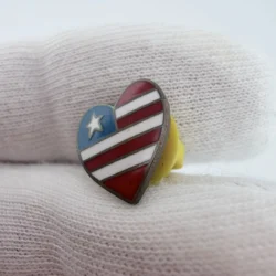 Patriotic heart pins combine national flag elements with symbolic shapes, often produced as small novelty or commemorative pieces reflecting American themes.