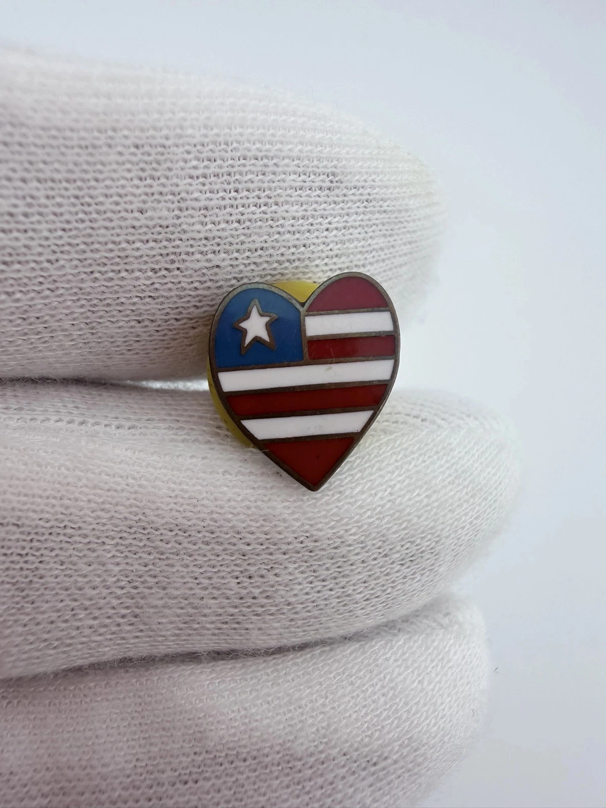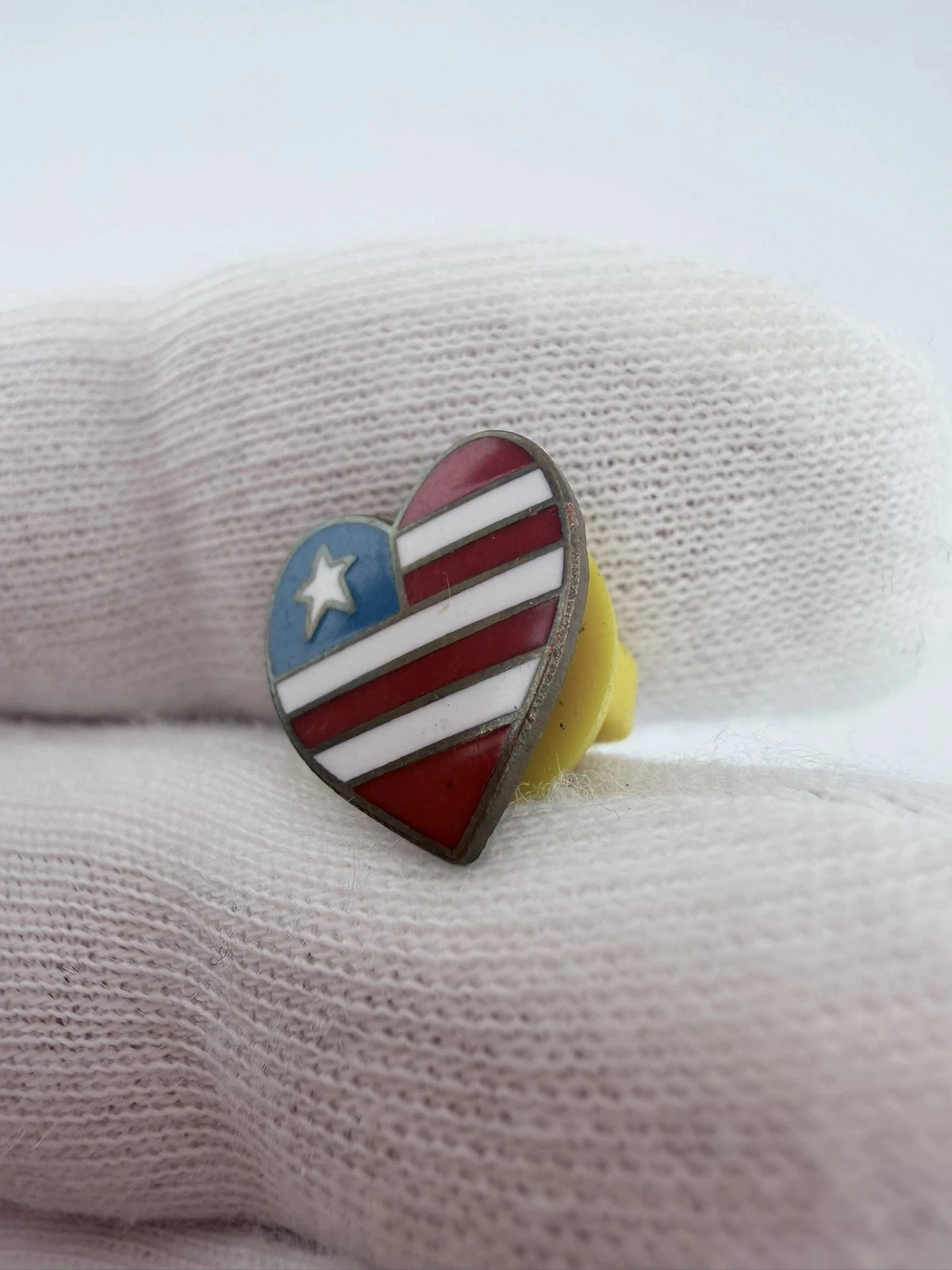 Patriotic heart pins combine national flag elements with symbolic shapes, often produced as small novelty or commemorative pieces reflecting American themes.