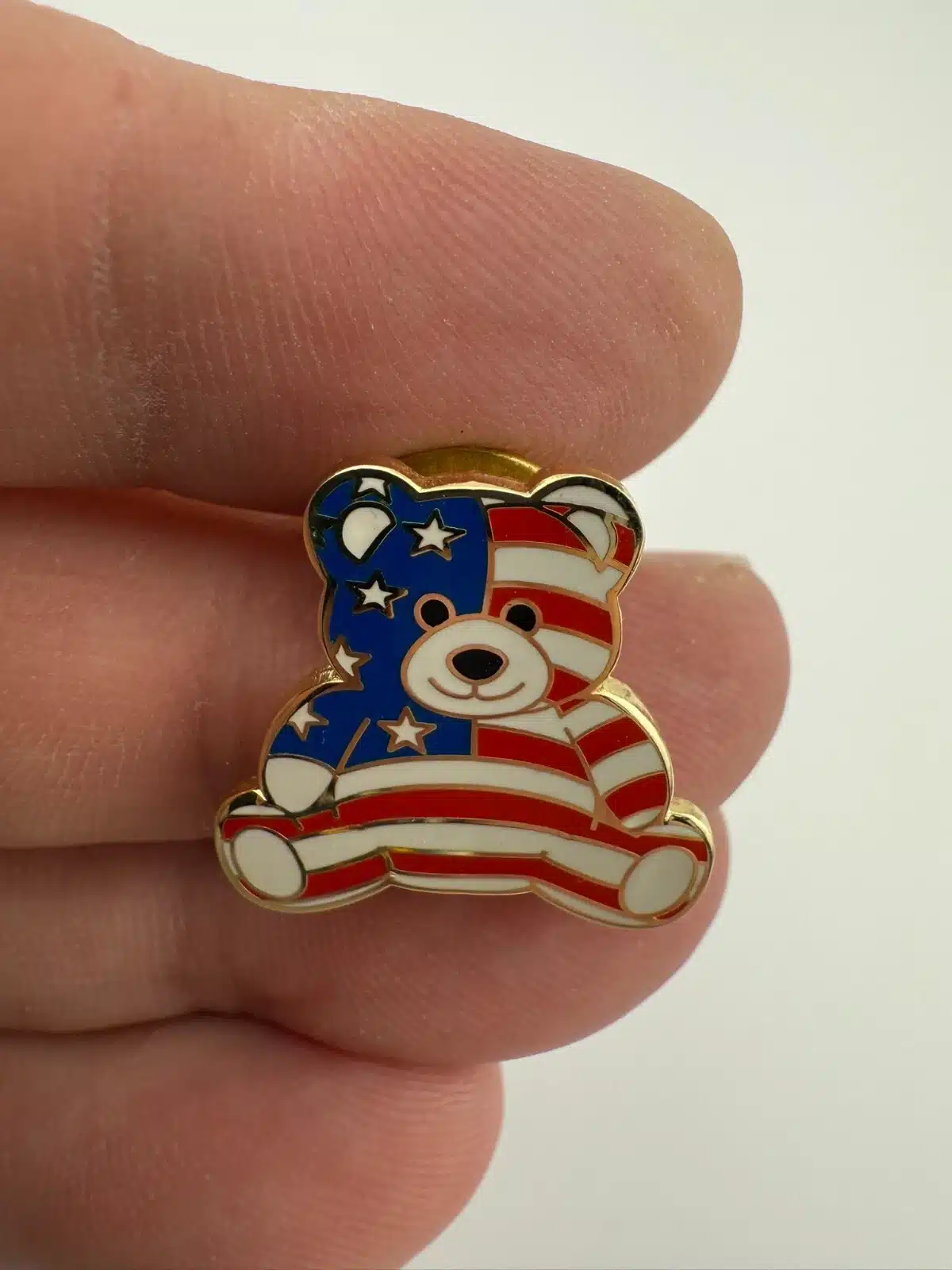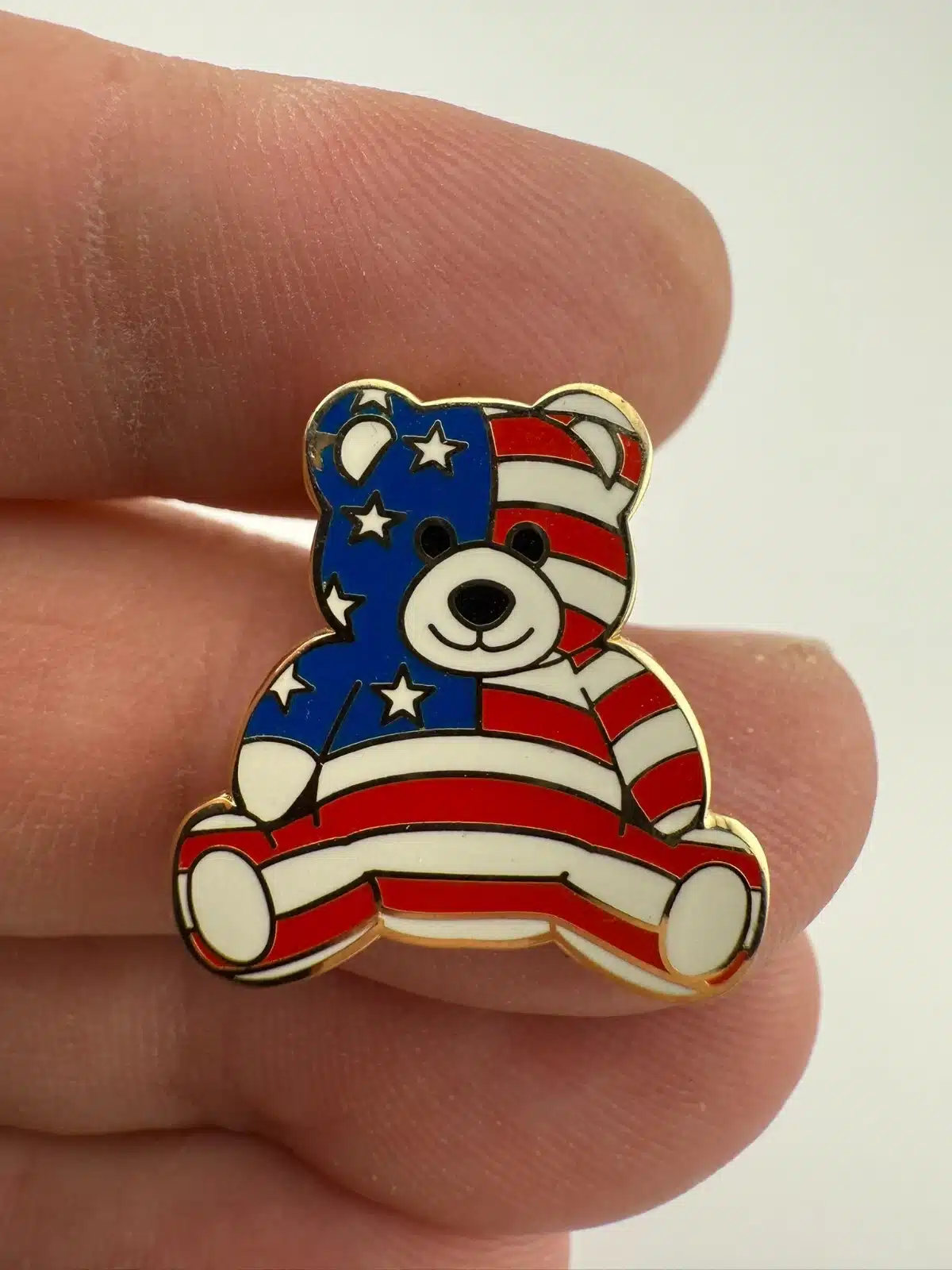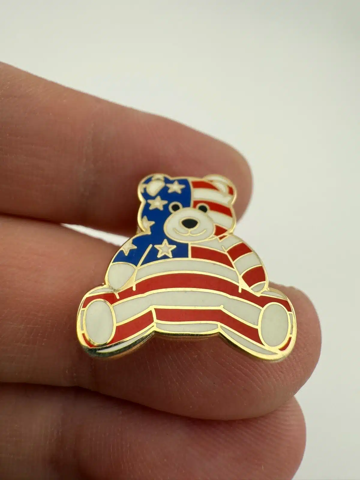 Patriotic Teddy Bear Enamel Pin with Red White and Blue Flag Overlay