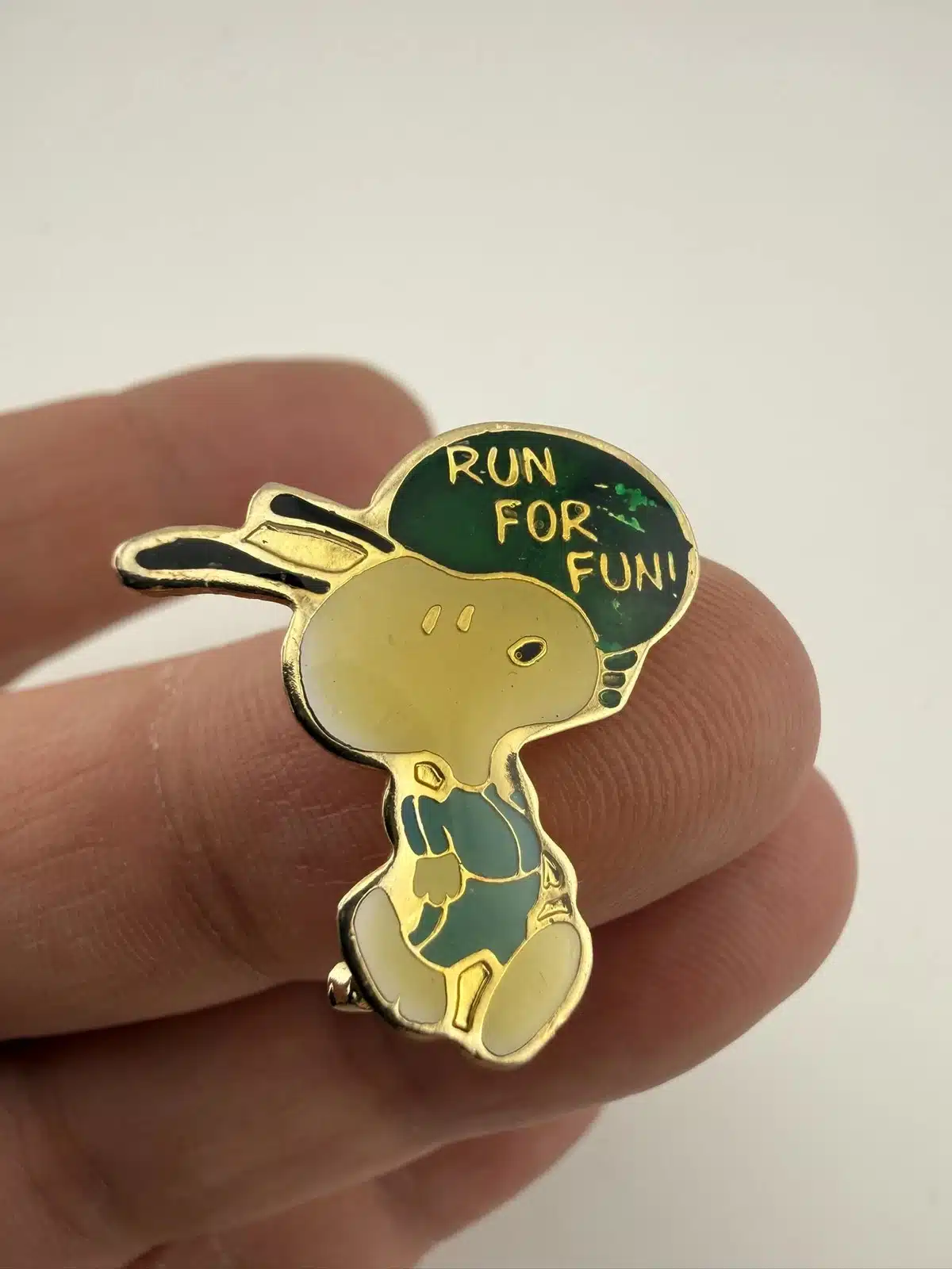 This pin showcases Snoopy in a dynamic running pose, embodying the playful spirit of the beloved Peanuts character. The accompanying thought bubble with the phrase ‘Run For Fun!’ adds a whimsical touch, reflecting the lighthearted themes of Charles Schulz’s iconic comic strip.