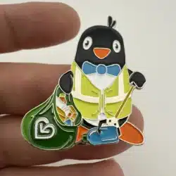 This charming lapel pin features an adorable penguin collecting trash while wearing a blue bow tie and a high visibility safety vest. The design promotes environmental awareness and conservation, making it a fitting addition to collections centered on wildlife and ecological themes.