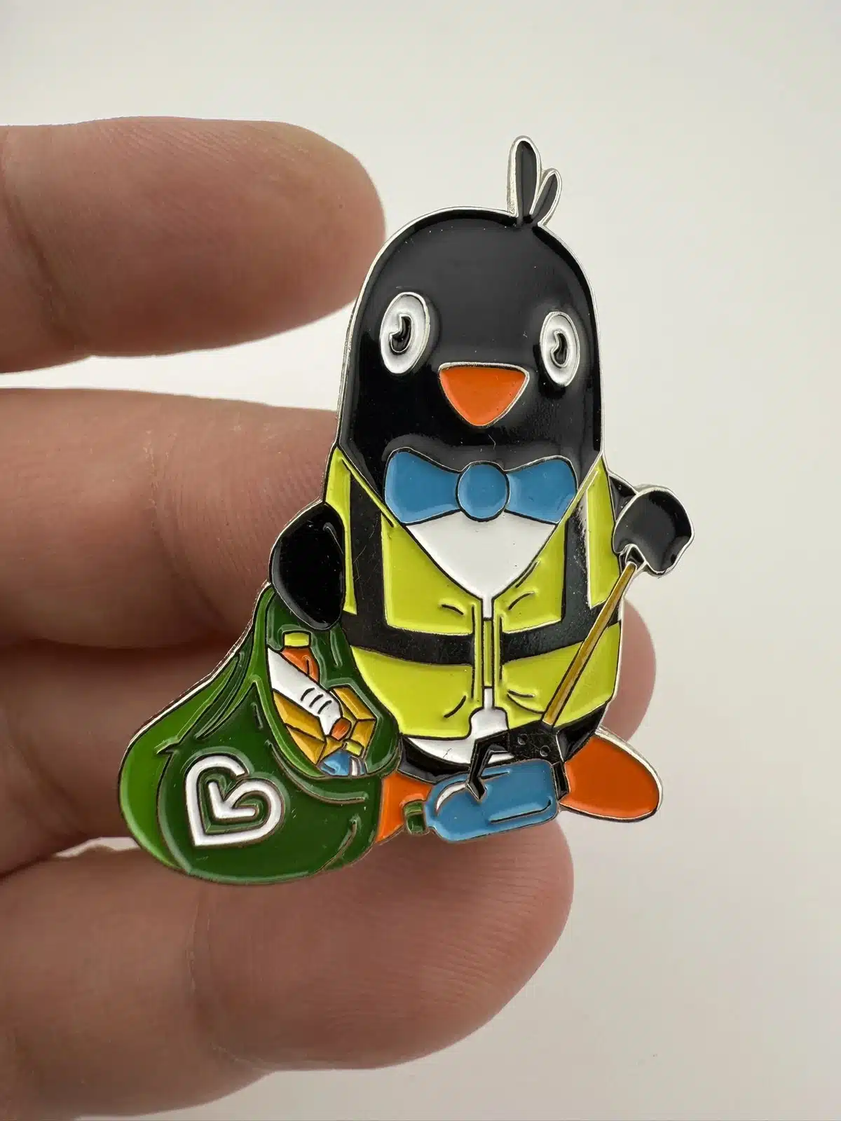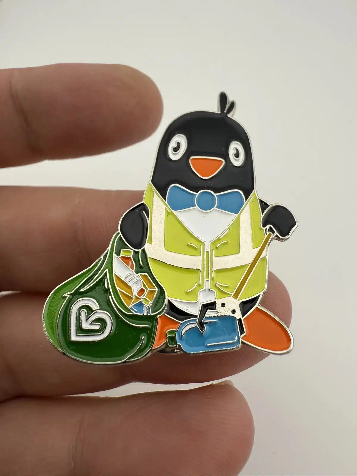 This charming lapel pin features an adorable penguin collecting trash while wearing a blue bow tie and a high visibility safety vest. The design promotes environmental awareness and conservation, making it a fitting addition to collections centered on wildlife and ecological themes.