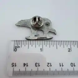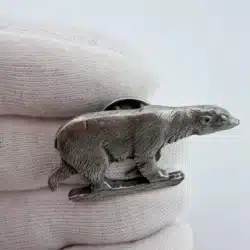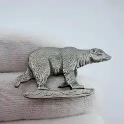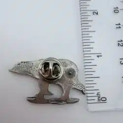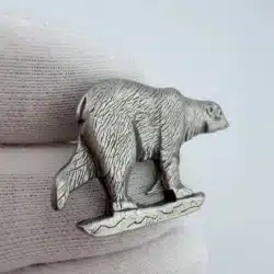 This pewter pin showcases a charming polar bear artfully balanced on a small piece of ice, capturing the essence of its natural habitat. Crafted in Canada, it reflects the country’s rich wildlife and commitment to preserving its unique ecosystems.