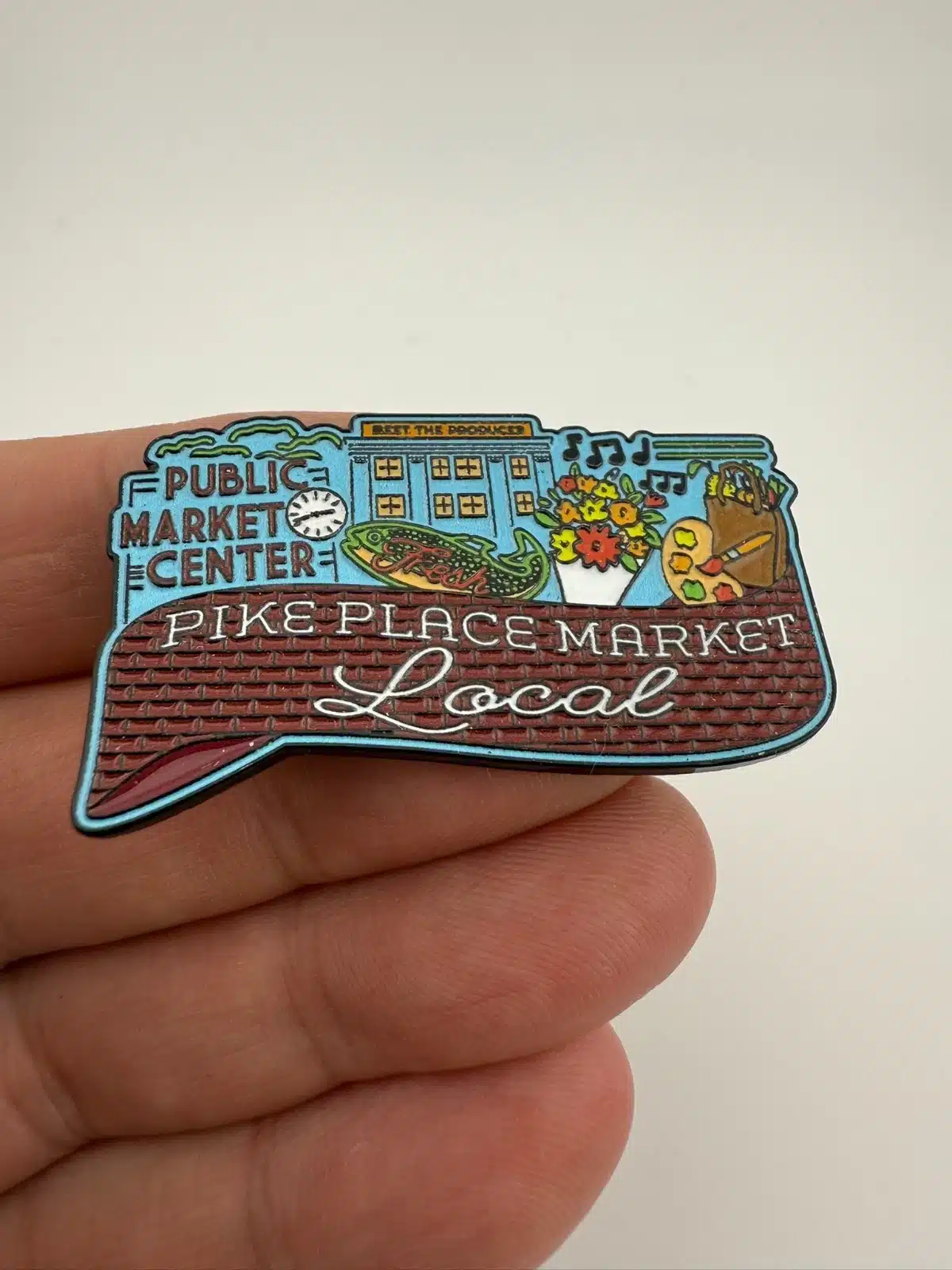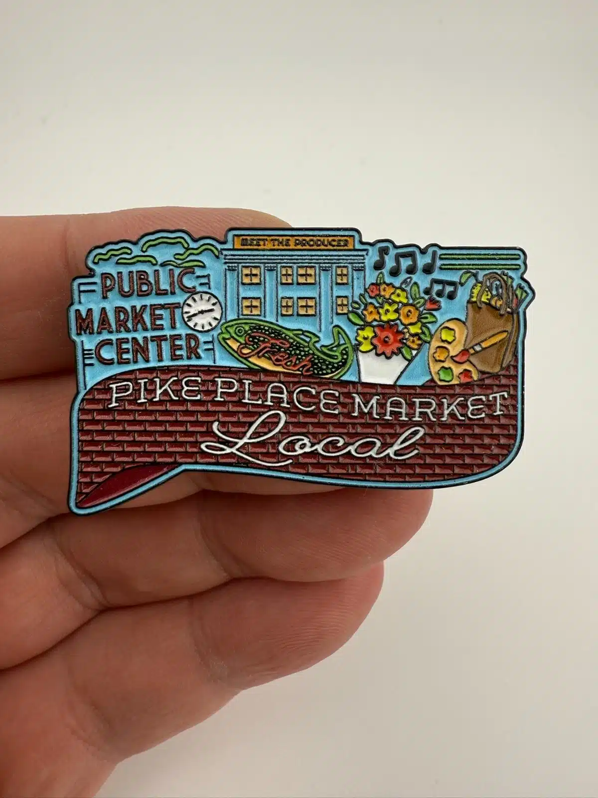 I only recently came across this Pike Place Market pin, and it’s a great little piece of Seattle history. It features the classic Public Market Center sign and clock, along with a fish, musical notes, flowers, and a Meet the Producer sign on top of the building. If you’re into Seattle collectibles, be sure to check out my other Seattle-themed pins, too.