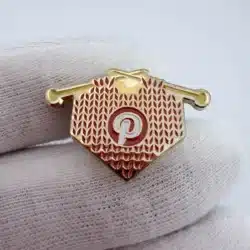 This promotional pin showcases two knitting needles intricately working on a badge-shaped item, prominently displaying the Pinterest logo. The design cleverly combines the themes of knitting and social media, representing the intersection of creativity and community. I believe this pin is from Knit Con, a Pinterest employee convention.