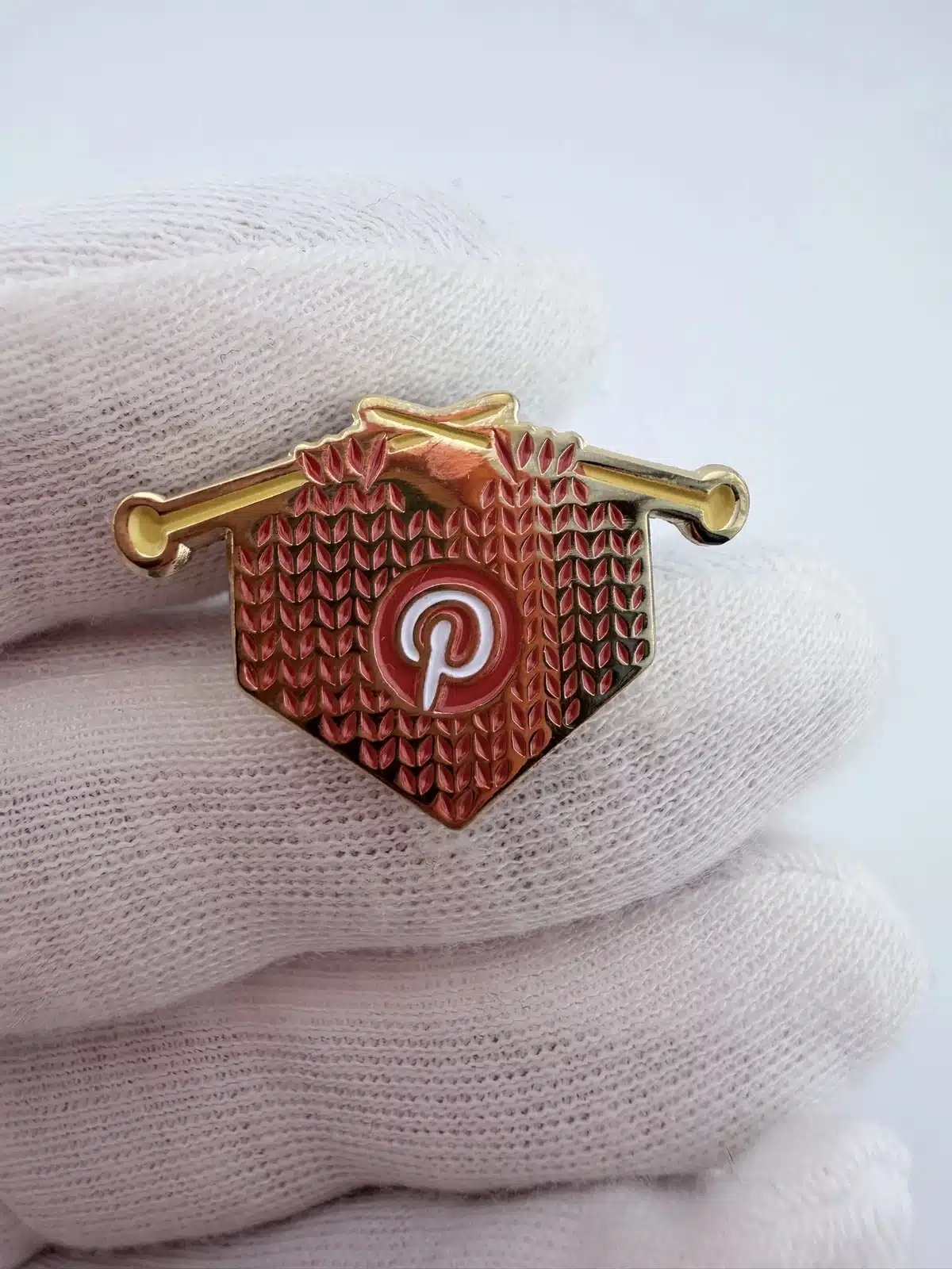 This promotional pin showcases two knitting needles intricately working on a badge-shaped item, prominently displaying the Pinterest logo. The design cleverly combines the themes of knitting and social media, representing the intersection of creativity and community. I believe this pin is from Knit Con, a Pinterest employee convention.