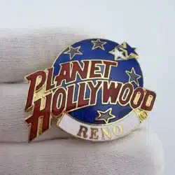 Decorated with a stylized earth and stars, this Planet Hollywood Reno pin features the bold red “Planet Hollywood” logo across the middle of the globe. The lower banner reads “Reno,” referencing the Nevada entertainment city where the restaurant once operated.