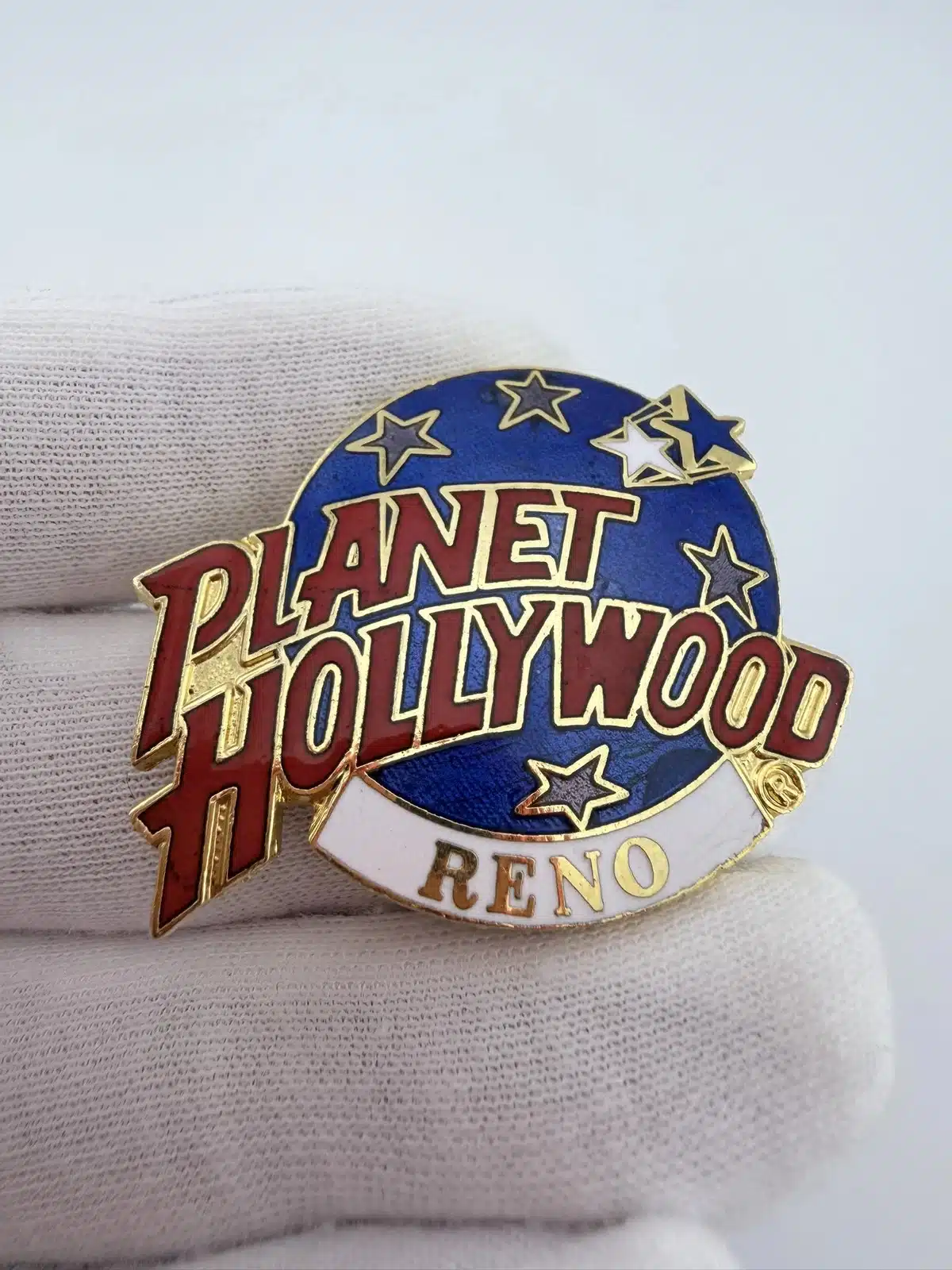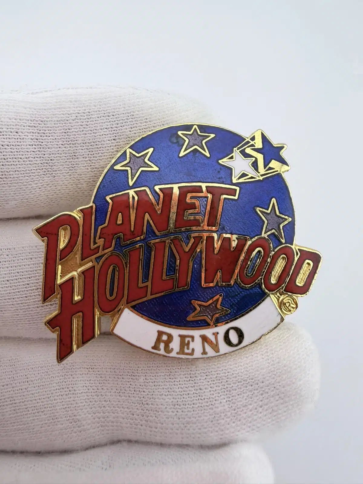 Decorated with a stylized earth and stars, this Planet Hollywood Reno pin features the bold red “Planet Hollywood” logo across the middle of the globe. The lower banner reads “Reno,” referencing the Nevada entertainment city where the restaurant once operated.