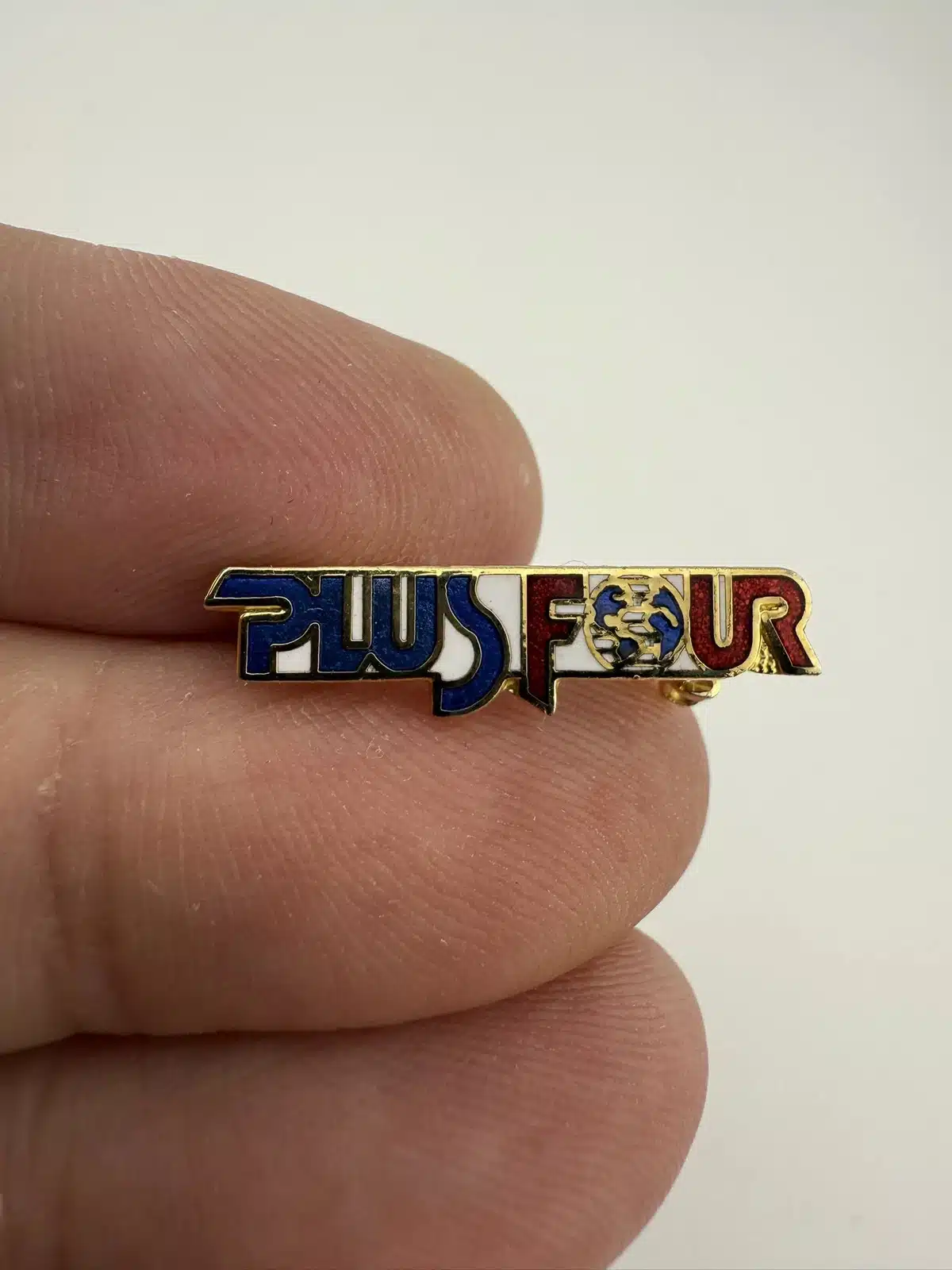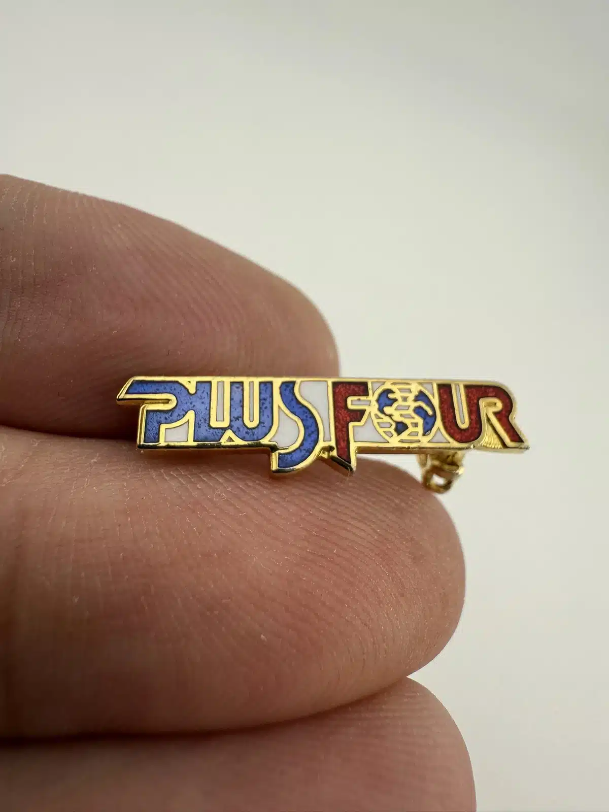 Unique Plus Four or PlusFour pin with a globe for the letter O. Possibly automotive?