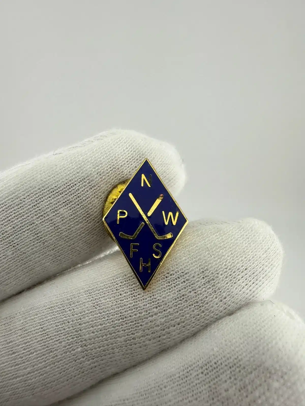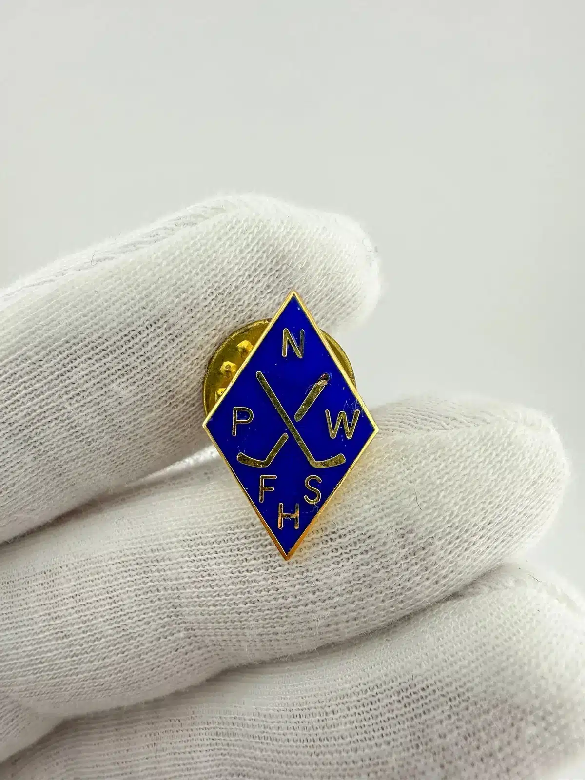 This diamond-shaped pin features the letters ‘PNW’ at the top and ‘FHS’ at the bottom, with crossed hockey sticks prominently displayed in the center. The design is enhanced by purple enamel and gold tone highlights, celebrating the Pacific Northwest Field Hockey community.