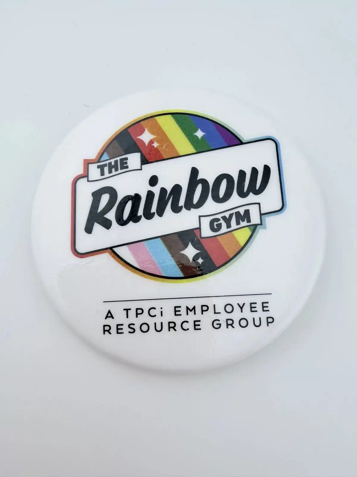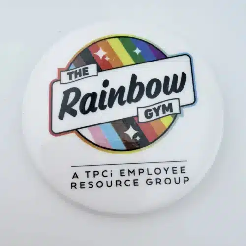 Extremely rare The Rainbow Gym employee pinback button from The Pokemon Company International (TPCi). The pin features an inclusive multi-colored logo at the top along with the words A TPCi Employee Resource Group below. Both a resource group for employees and a reference to Celadon City Gym in the Kanto region.