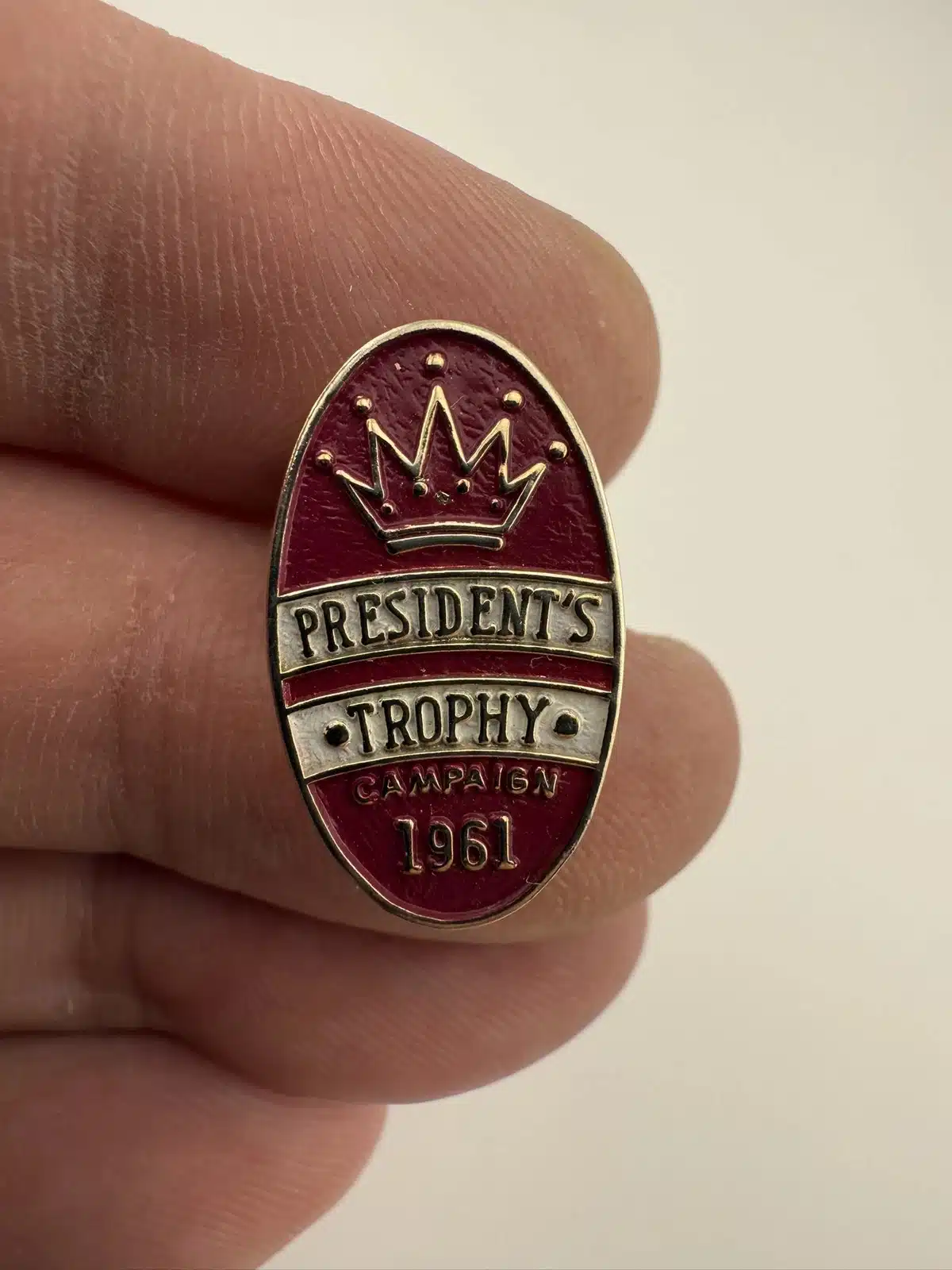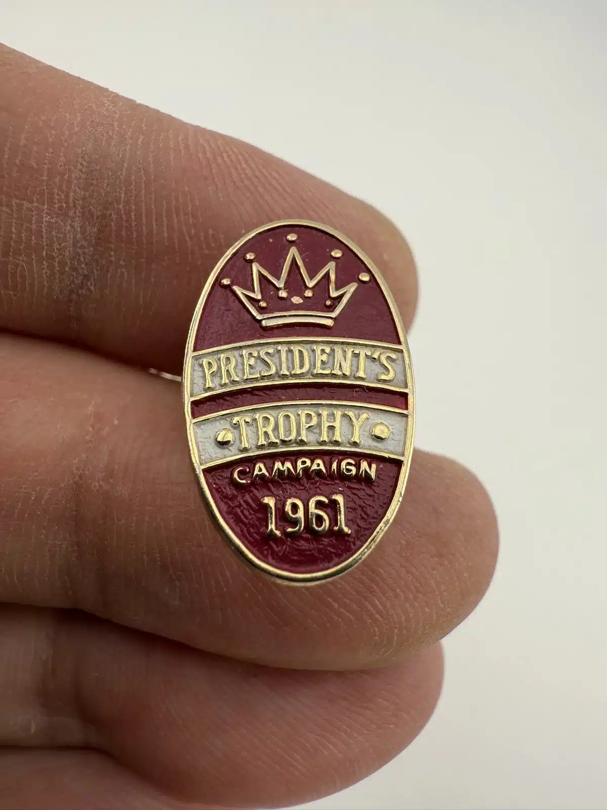 Unknown vintage lapel pin that reads President’s Trophy Campaign 1961. Pin has a crown at top.