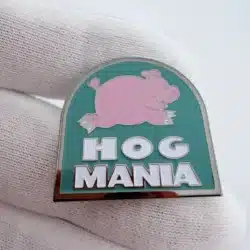 This vibrant pin features a playful pink pig in motion set against a lively green background, capturing the fun and energetic spirit of the Puyallup Fair. Bold white lettering below the pig prominently displays ‘HOG MANIA,’ giving the design strong contrast and immediate visual impact.