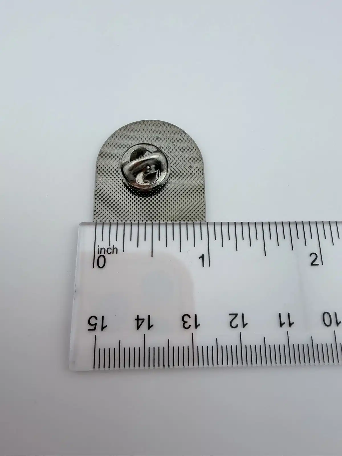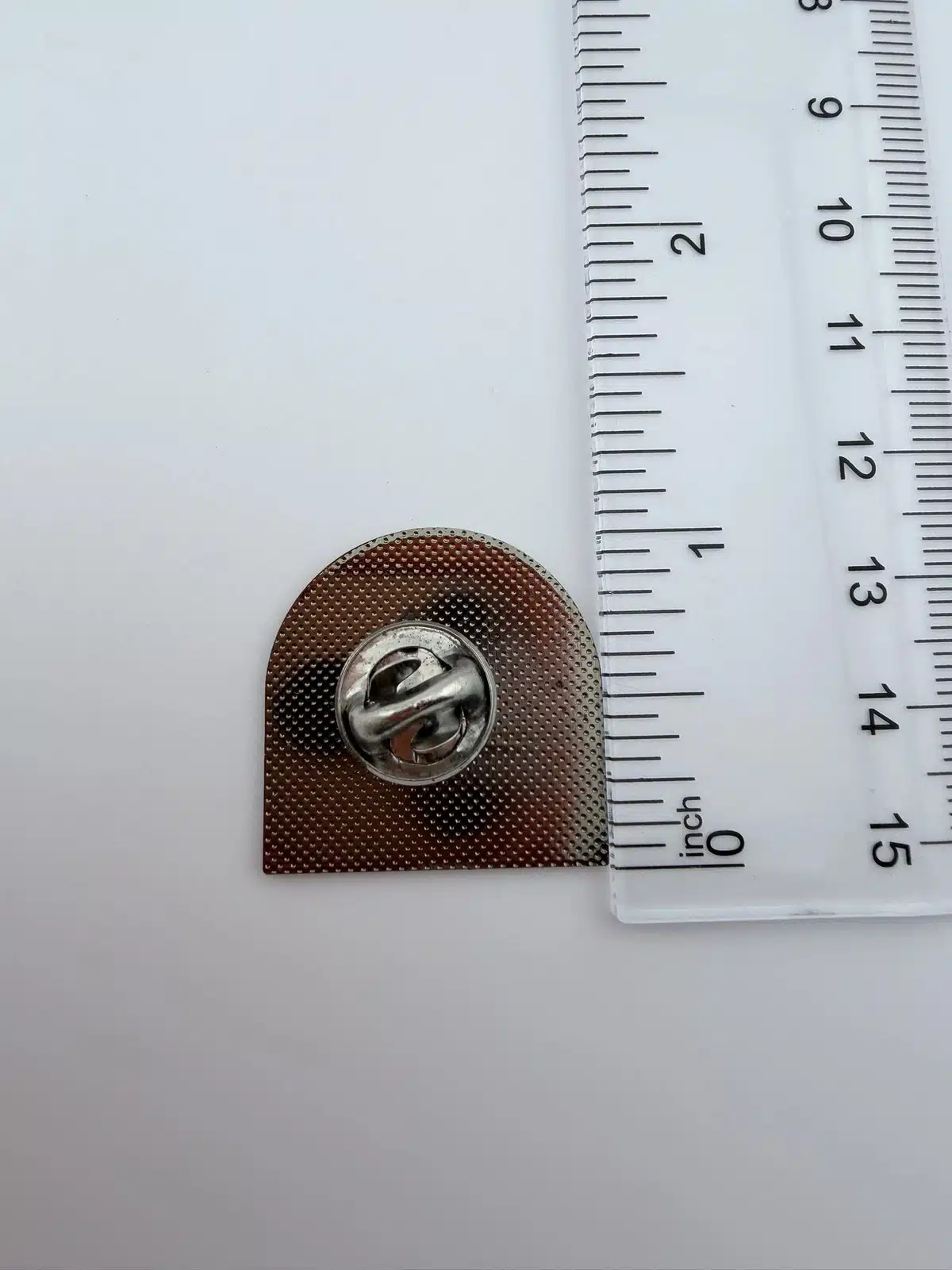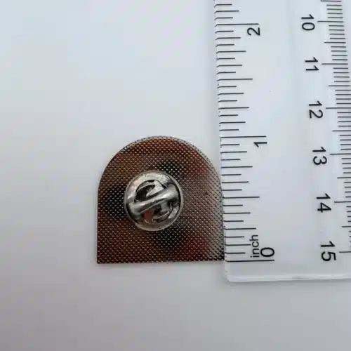 Measuring approximately 1 inch wide by 1 inch tall, the pin is arch shaped, resembling a small window. The unique silhouette adds character to the piece and helps it stand out among traditional square or circular fair pins.