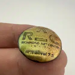 I believe this pin was produced for the Richmond Art Center’s 75th anniversary gala in 2011. Likely handmade and uniquely designed, it features a stylized RAC logo with “Arts Alive! 75” along the bottom. It is unclear whether this was distributed as an event giveaway or part of an award or auction. The Richmond Art Center is a nonprofit visual arts organization located in Richmond, California. It was founded in 1936, making it one of the oldest continuously operating community art centers in the United States.