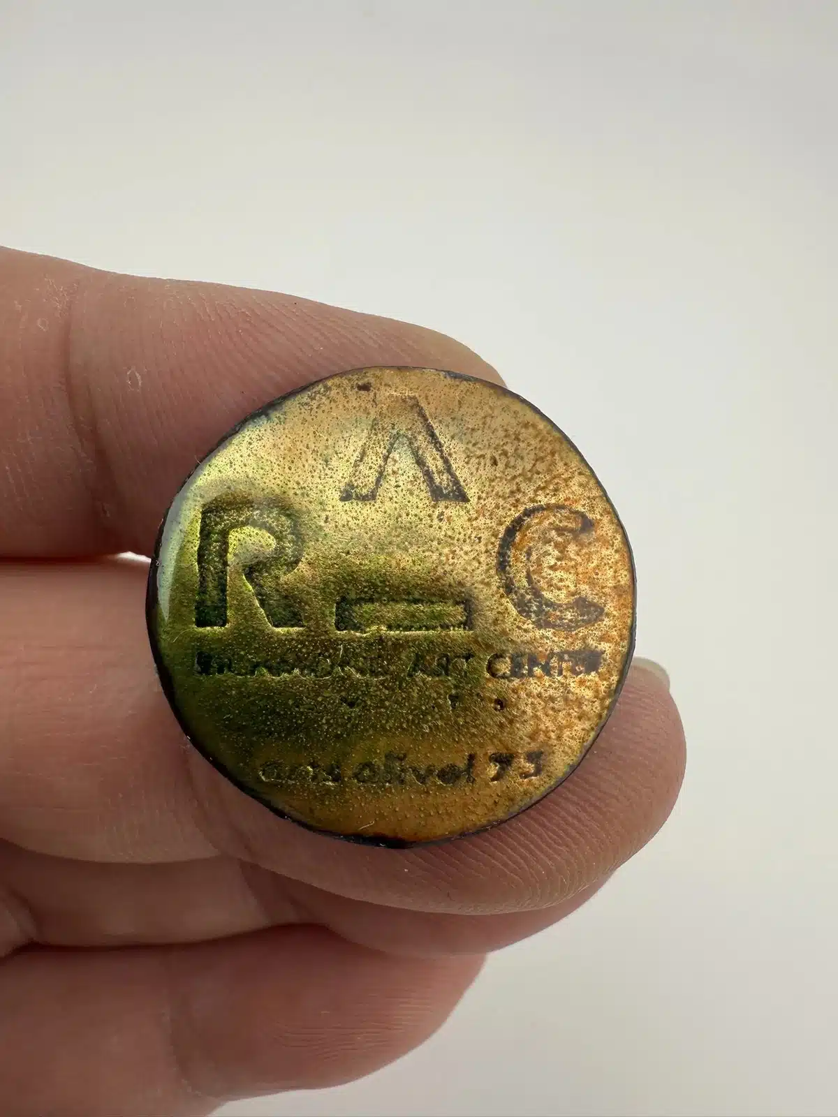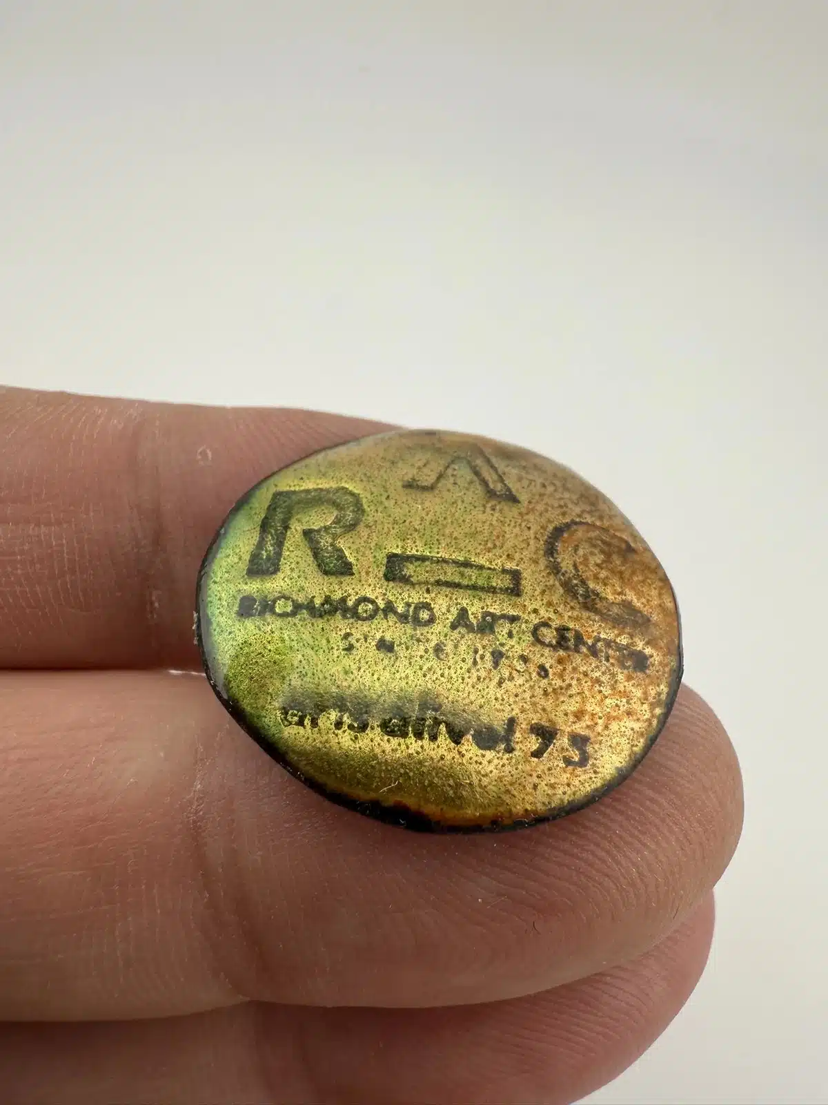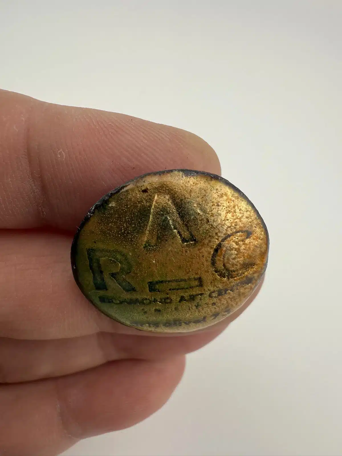 I believe this pin was produced for the Richmond Art Center’s 75th anniversary gala in 2011. Likely handmade and uniquely designed, it features a stylized RAC logo with “Arts Alive! 75” along the bottom. It is unclear whether this was distributed as an event giveaway or part of an award or auction. The Richmond Art Center is a nonprofit visual arts organization located in Richmond, California. It was founded in 1936, making it one of the oldest continuously operating community art centers in the United States.