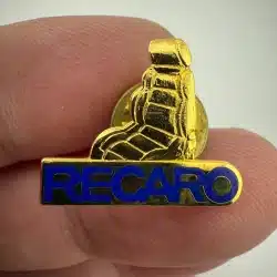 A Recaro Brand Car Seats lapel pin features the iconic Recaro logo on a race seat, representing a legacy of high-performance automotive seating.