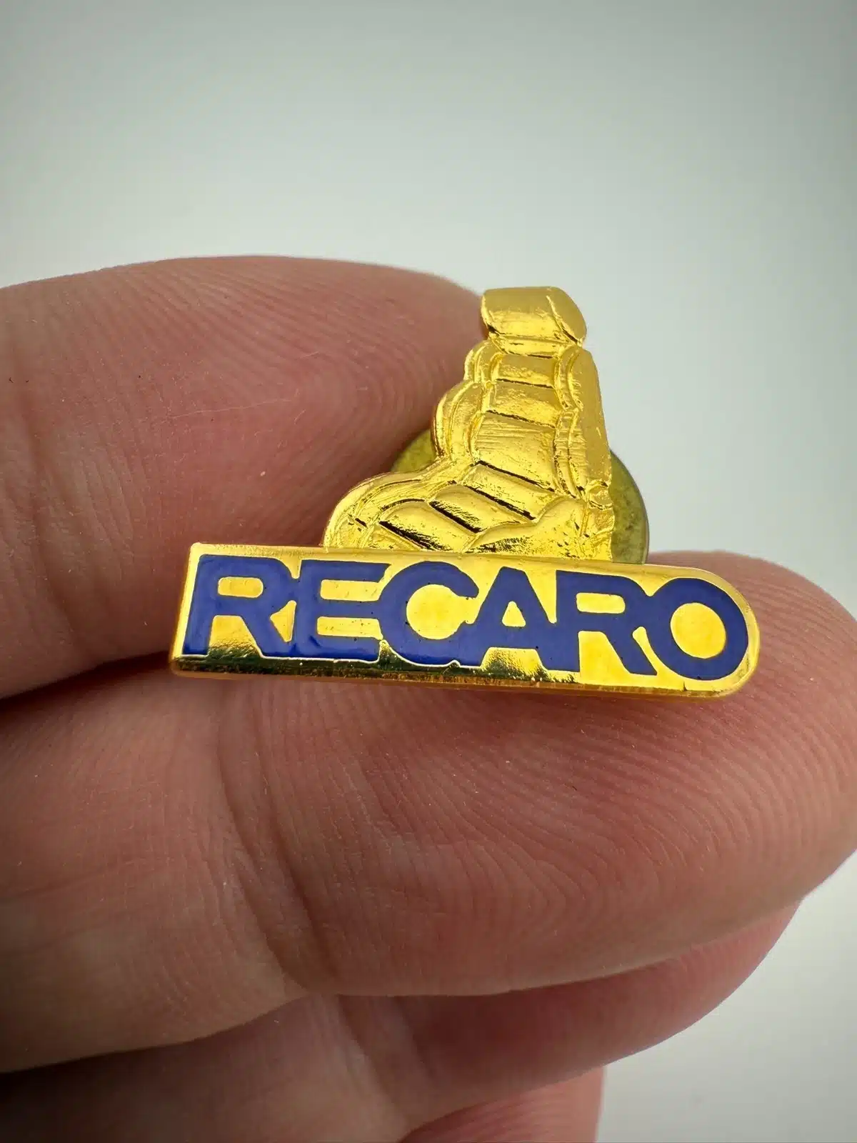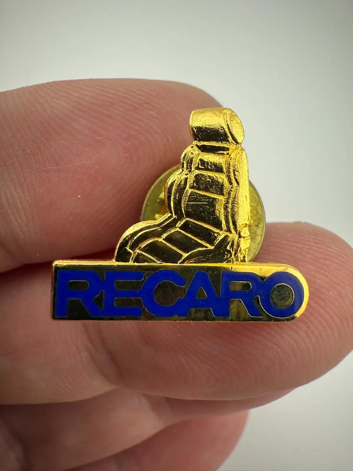 A Recaro Brand Car Seats lapel pin features the iconic Recaro logo on a race seat, representing a legacy of high-performance automotive seating.