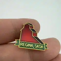 This vintage lapel pin features a detailed depiction of a red barn, symbolizing the agricultural heritage of Regina, Saskatchewan. The design captures the rustic charm associated with the region’s farming community, making it a notable piece of local history.