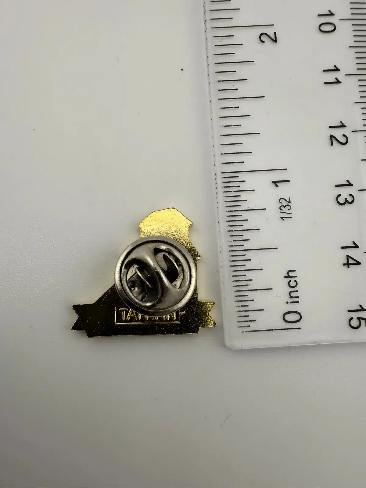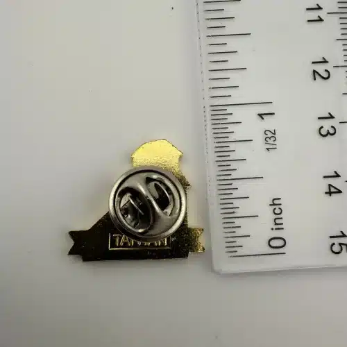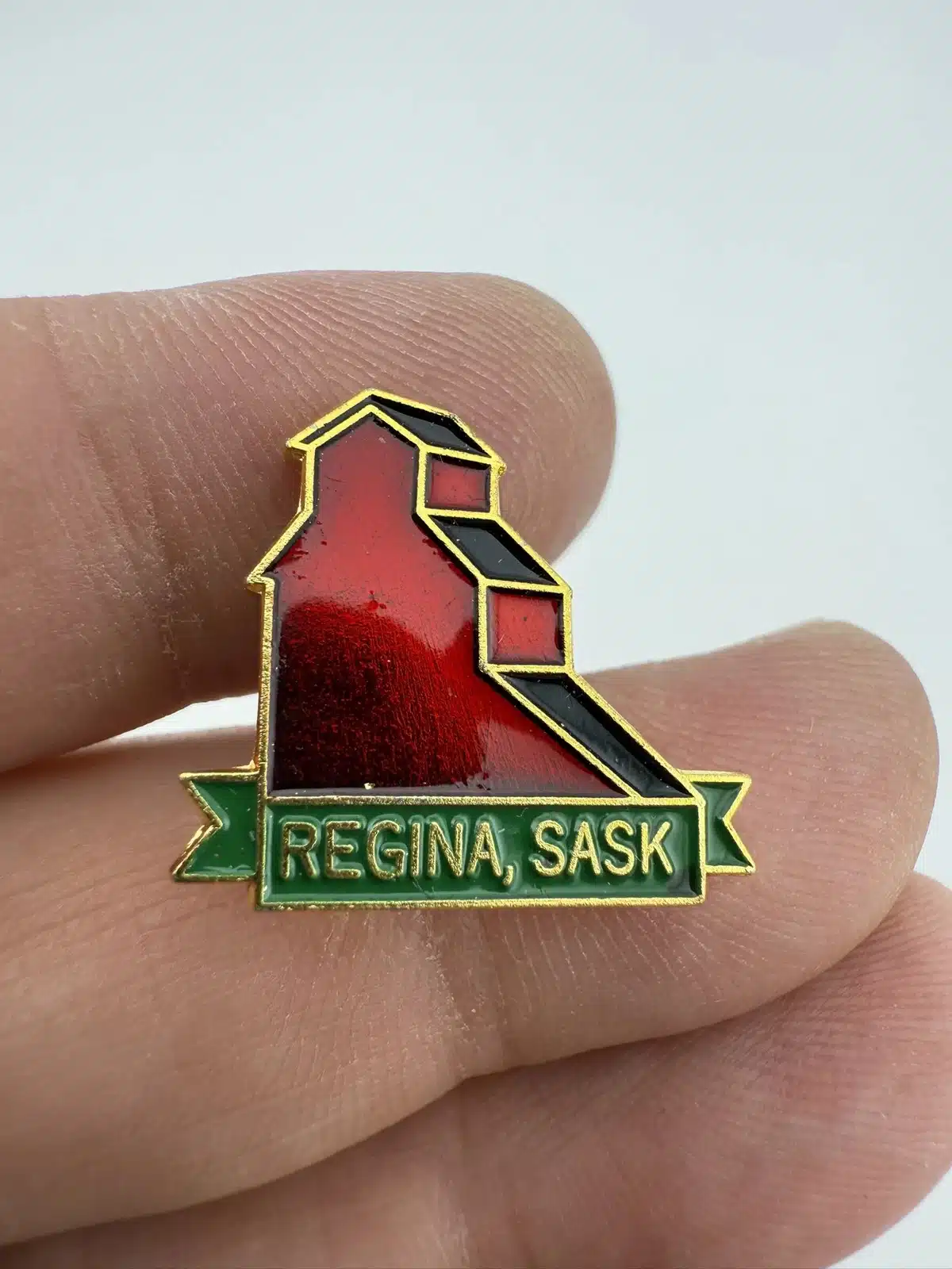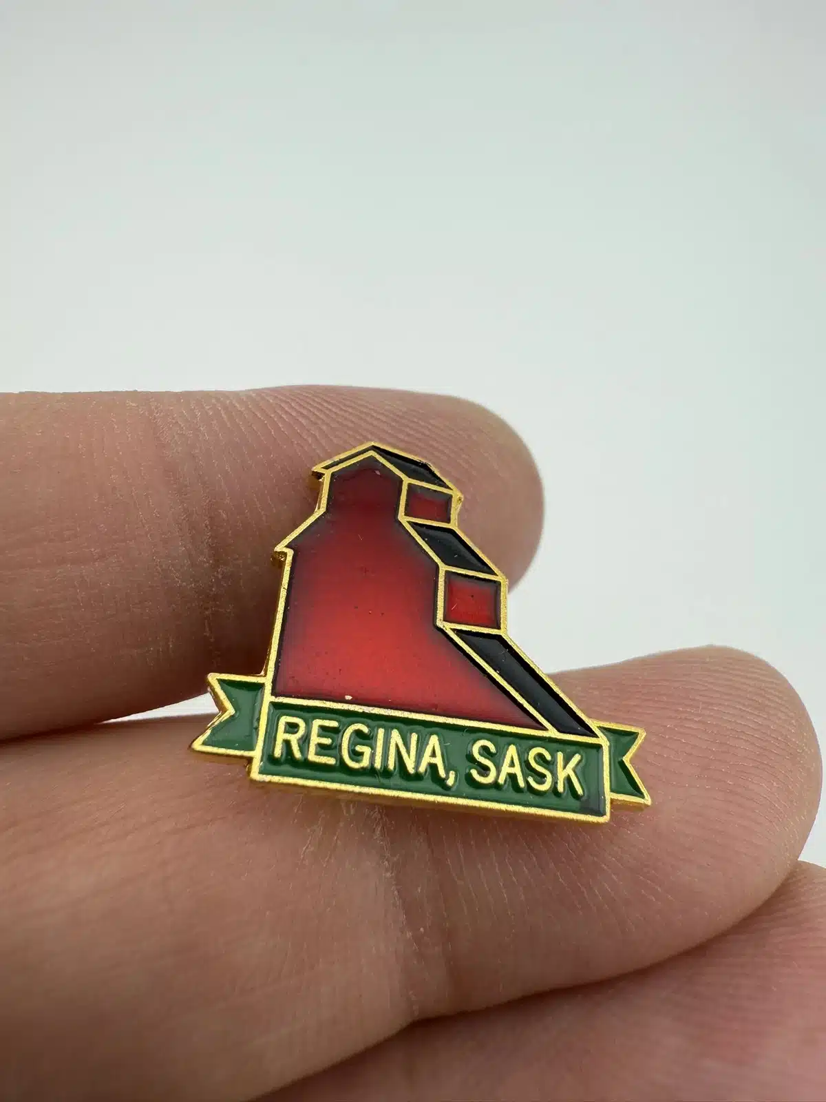 This vintage lapel pin features a detailed depiction of a red barn, symbolizing the agricultural heritage of Regina, Saskatchewan. The design captures the rustic charm associated with the region’s farming community, making it a notable piece of local history.
