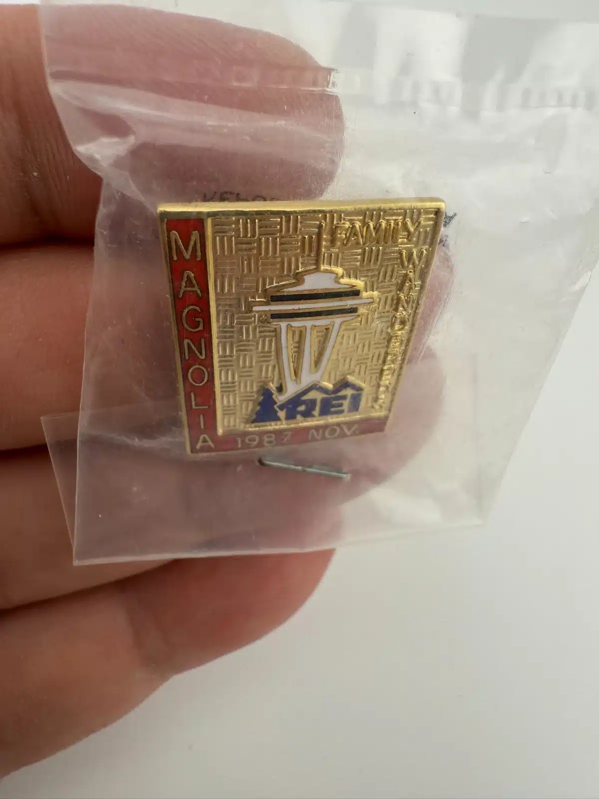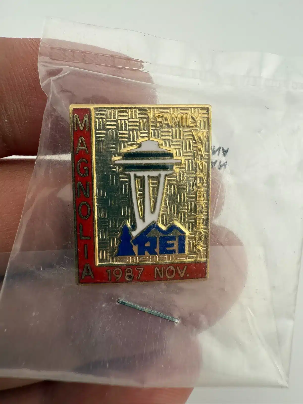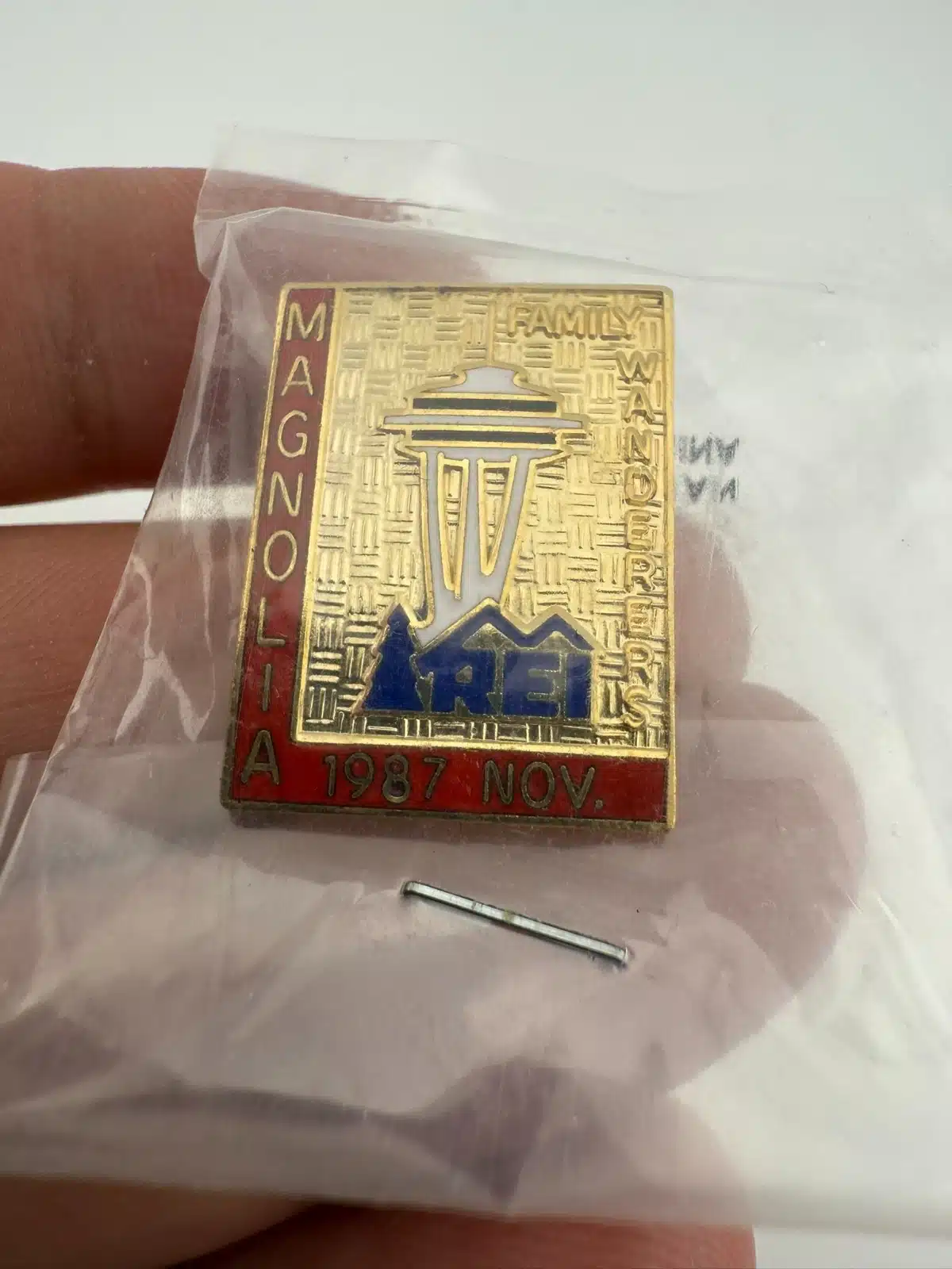 The REI Magnolia 1987 November Enamel Pin features the iconic Space Needle, commemorating the 1987 event. Possibly a Family Wanderers event.