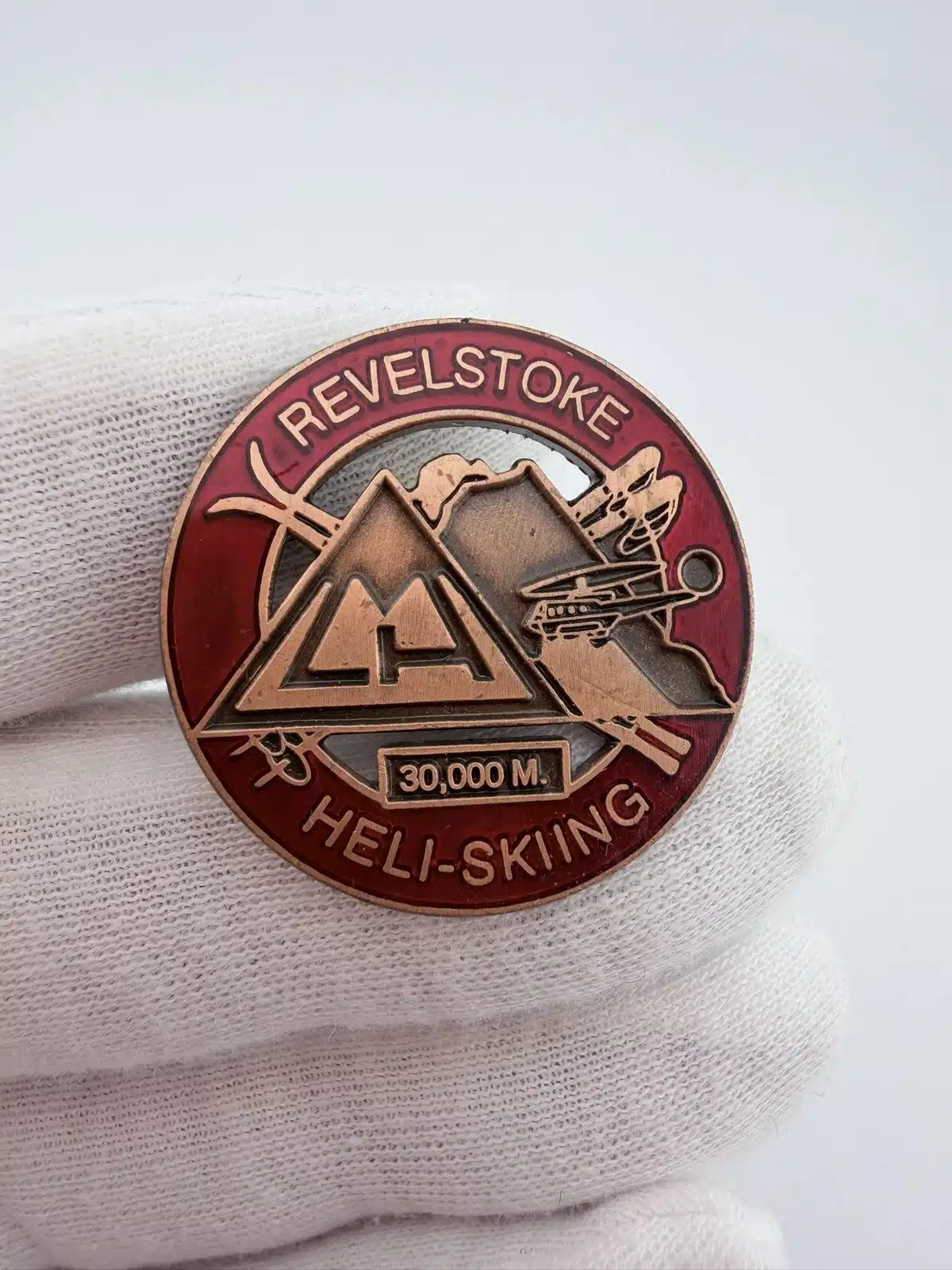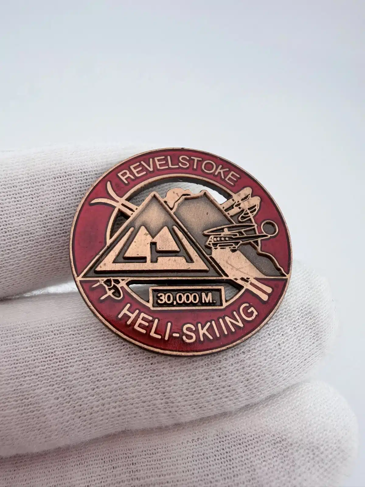 Revelstoke CMH Heli-Skiing pin features a circular design with red enamel and detailed alpine imagery tied to the heli-skiing operation in Revelstoke, British Columbia. The top reads “Revelstoke,” with the CMH logo on the left and skis and a small helicopter incorporated into the design, while the bottom reads “Heli-Skiing” with a “30,000M” designation.