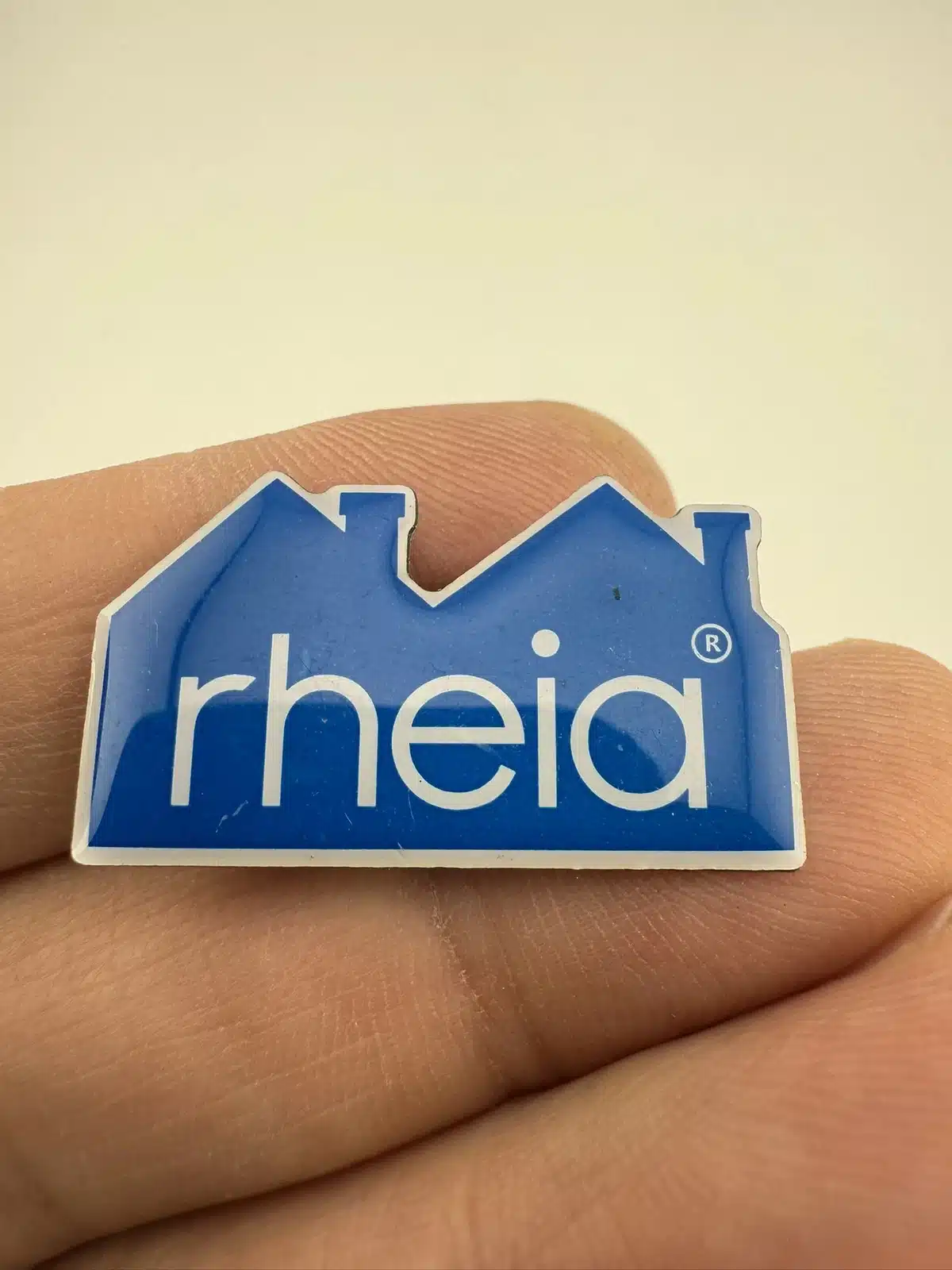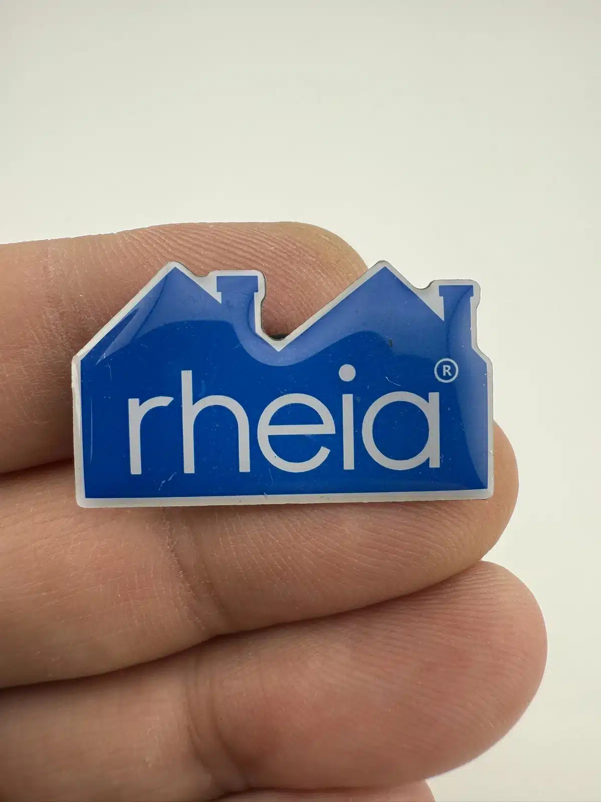 This promotional lapel pin features a charming blue house design adorned with bold white ‘RHEIA’ lettering, representing the Rheia HVAC brand. The pin’s vibrant colors and distinct shape make it a notable piece for collectors interested in HVAC industry memorabilia.