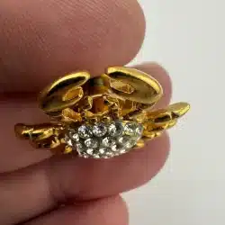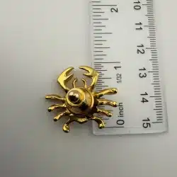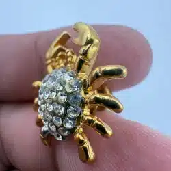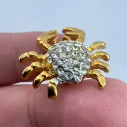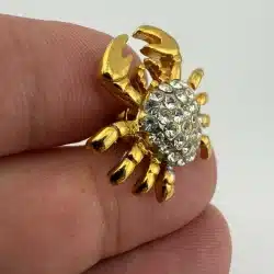 Formed in a crab shape, this pin features gold tone claws and legs surrounding a body set with rhinestones. The design highlights the contrast between the metallic outer structure and the textured, reflective center.