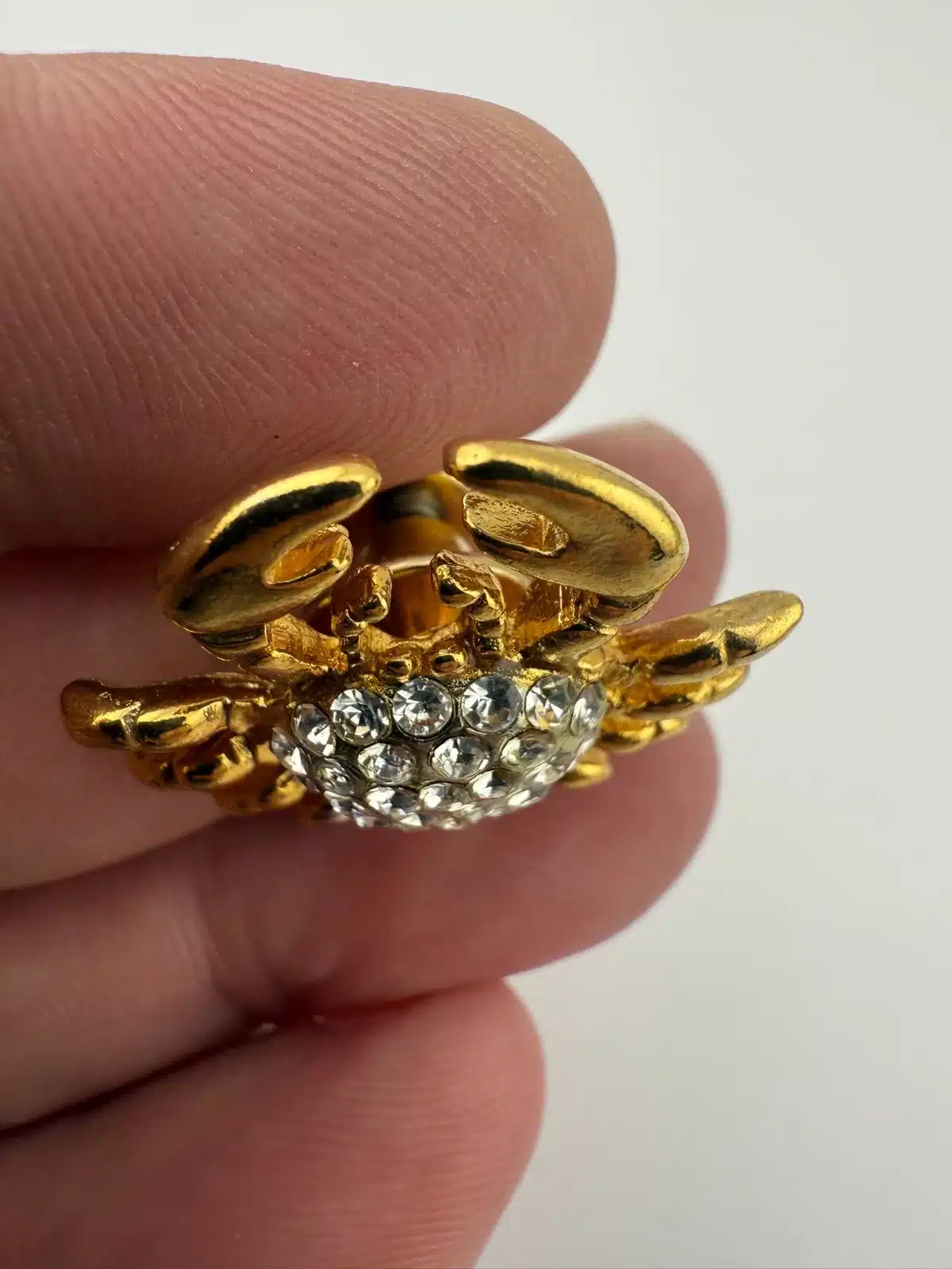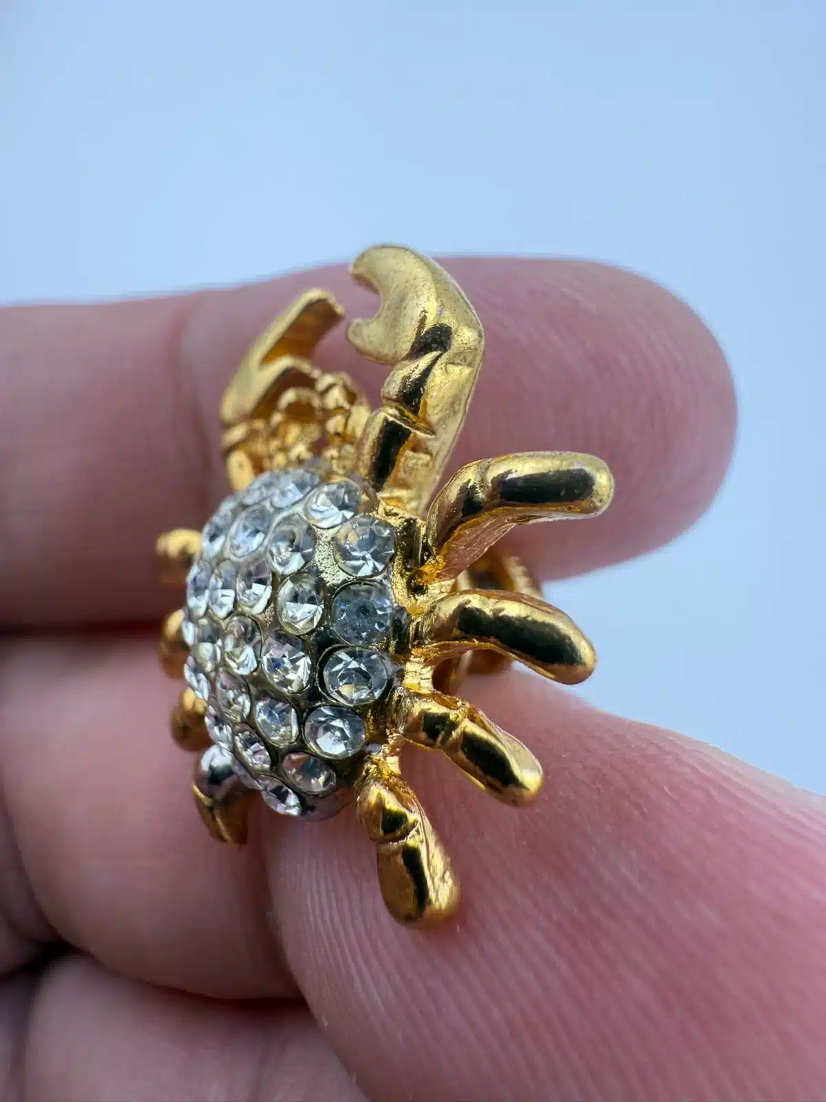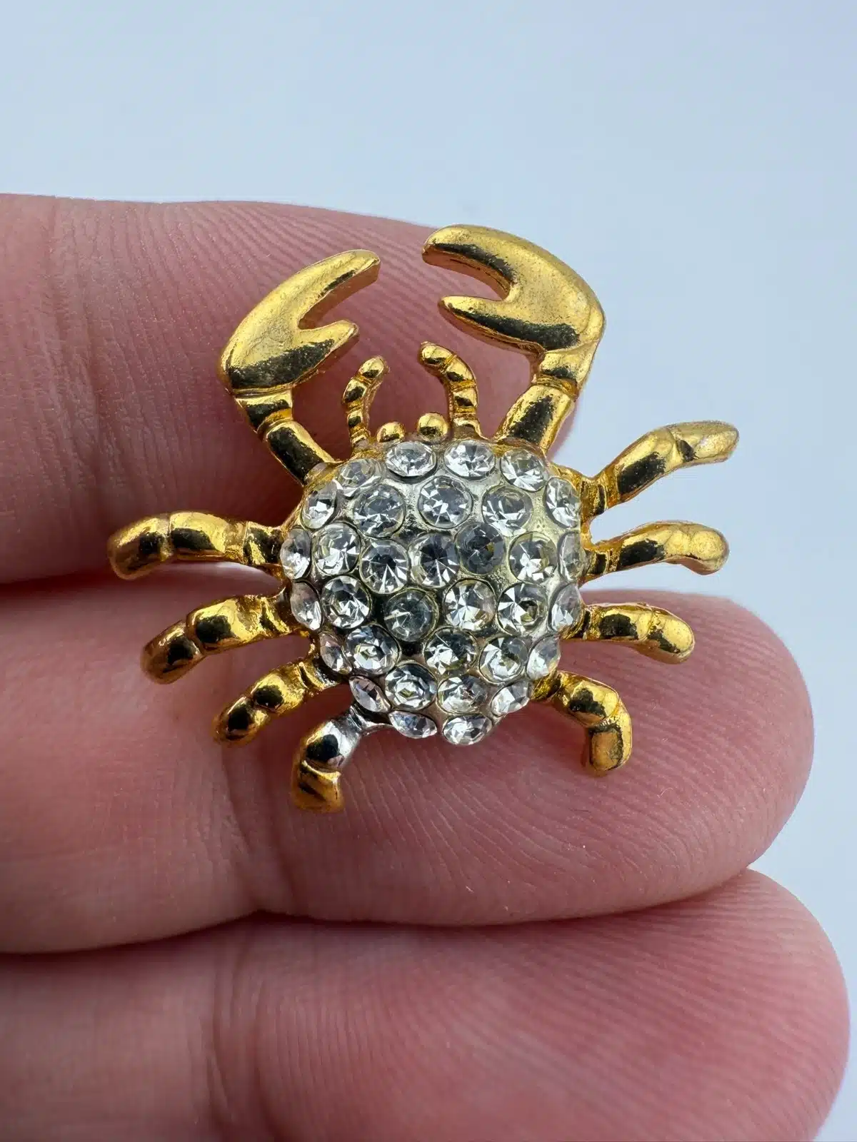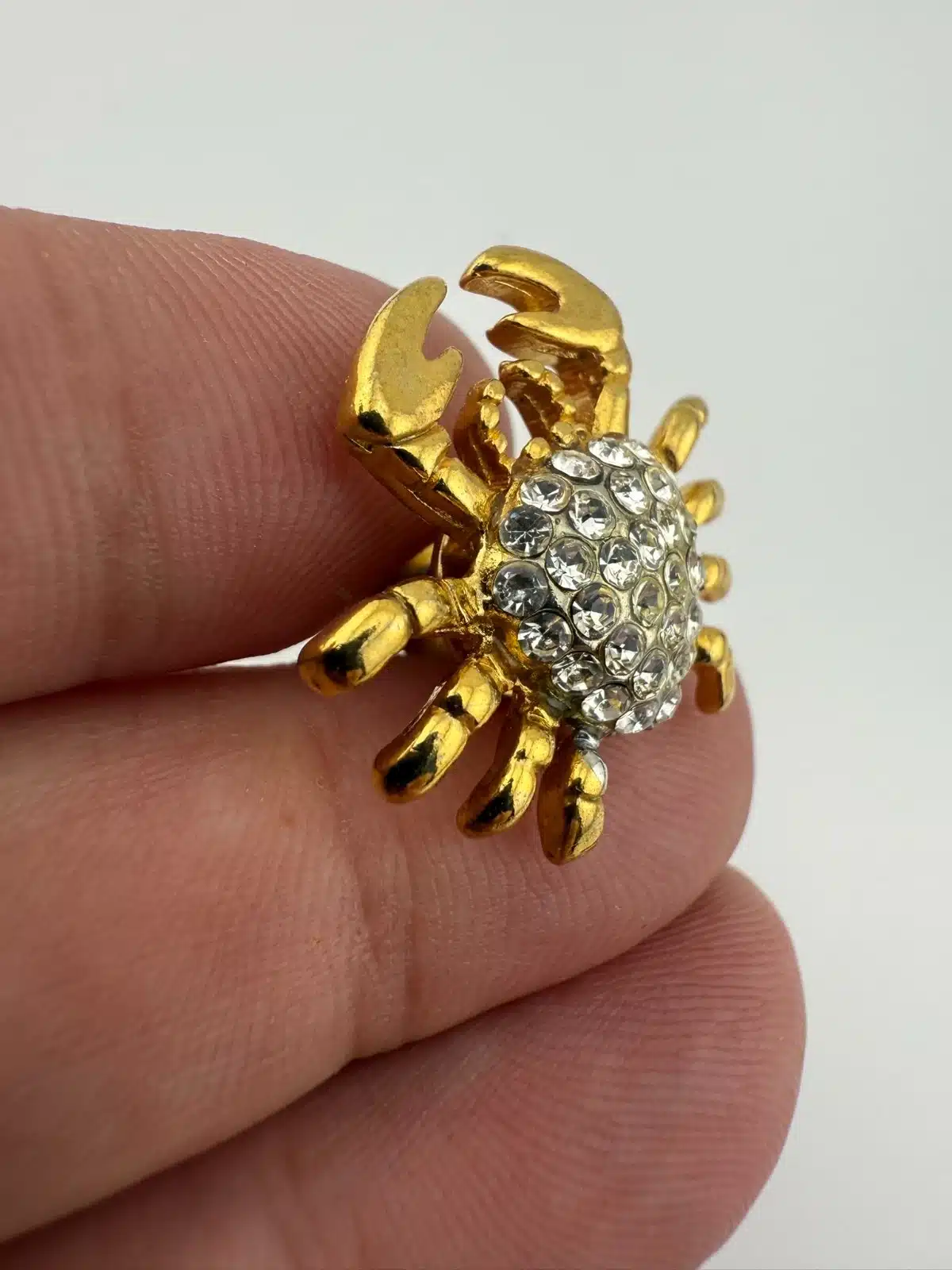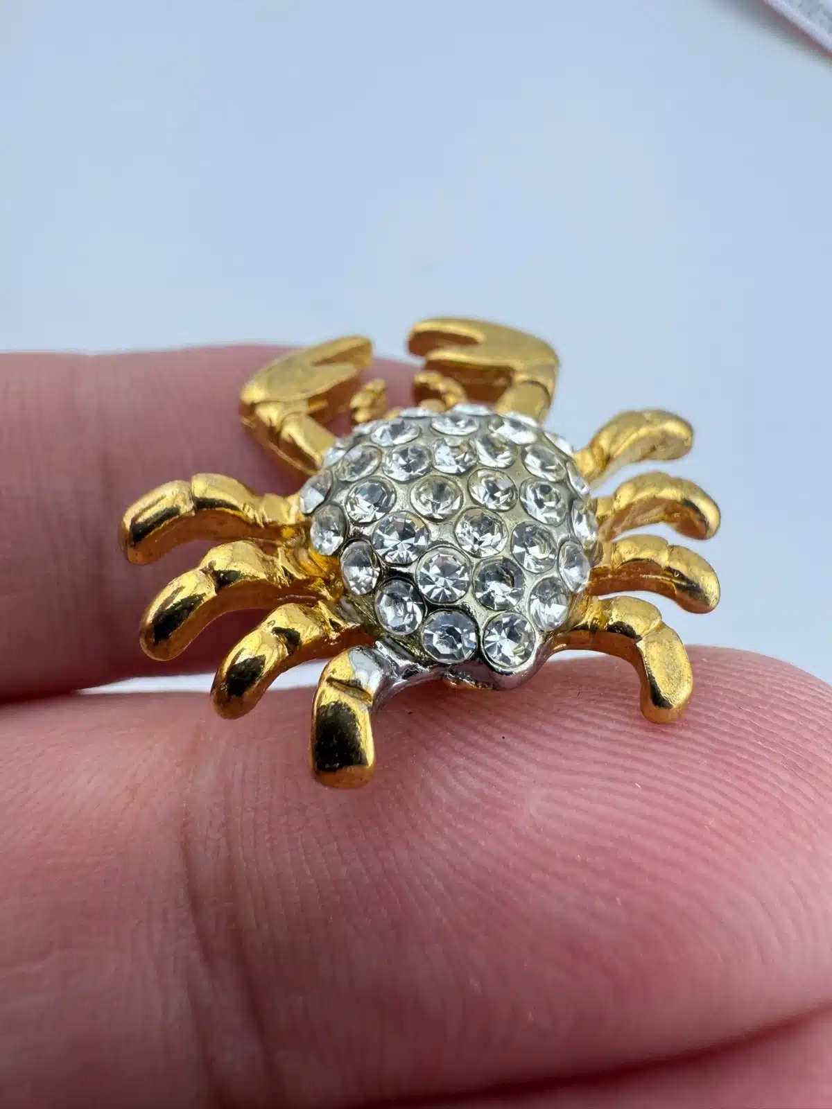 Formed in a crab shape, this pin features gold tone claws and legs surrounding a body set with rhinestones. The design highlights the contrast between the metallic outer structure and the textured, reflective center.