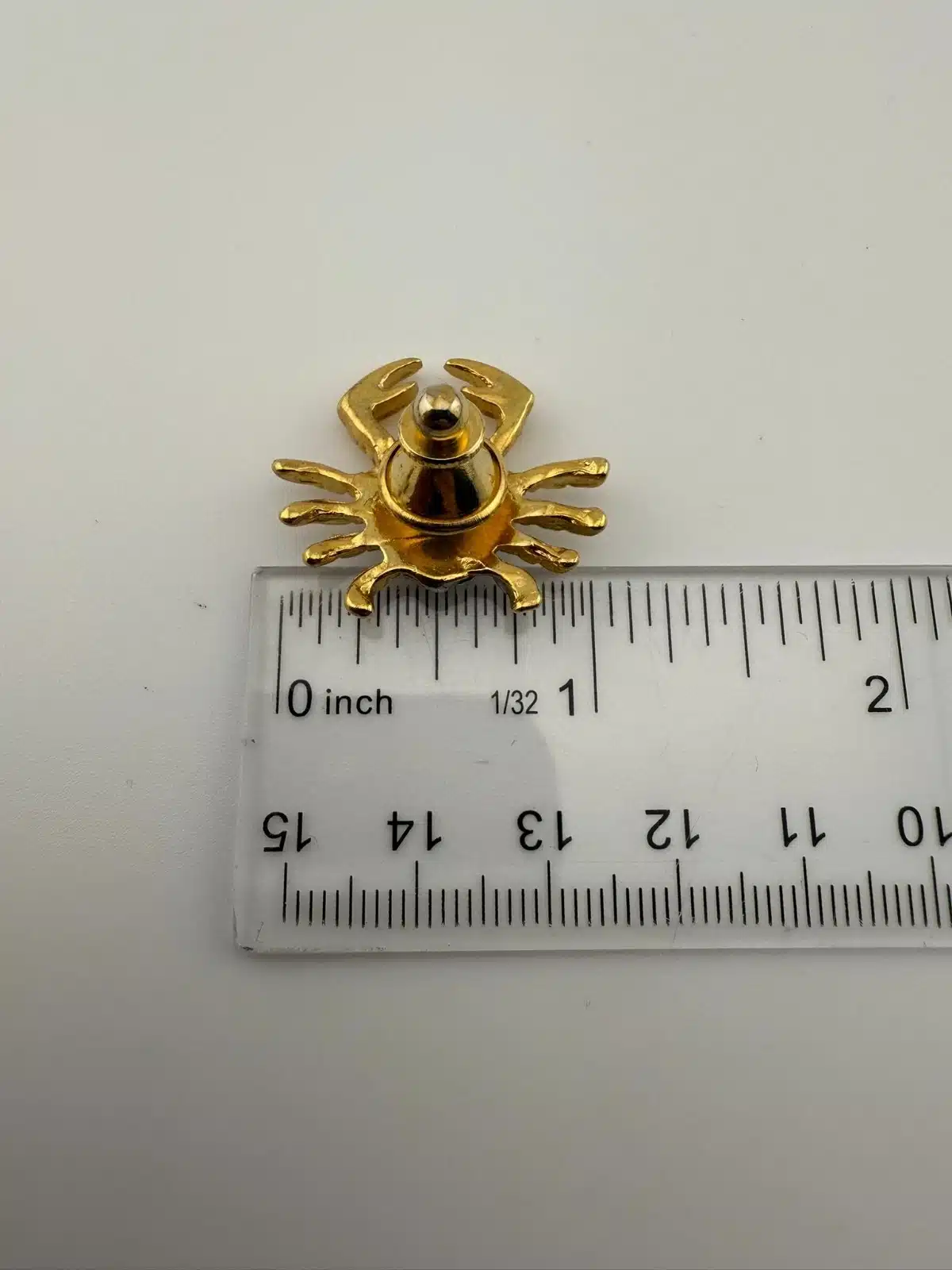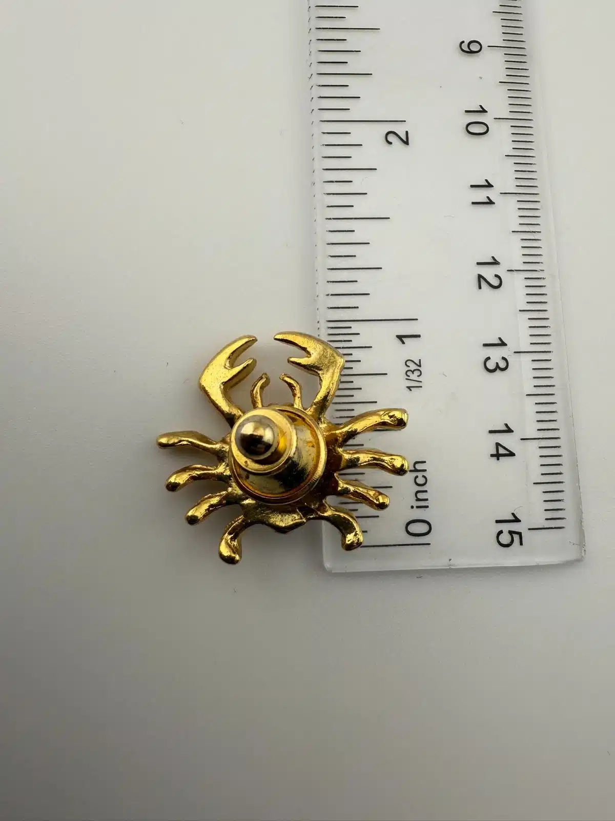 Crab motif jewelry has been produced in various styles, often drawing from coastal and marine themes in decorative accessories. Pin measures approximately 1 inch in width by 1 inch in height.