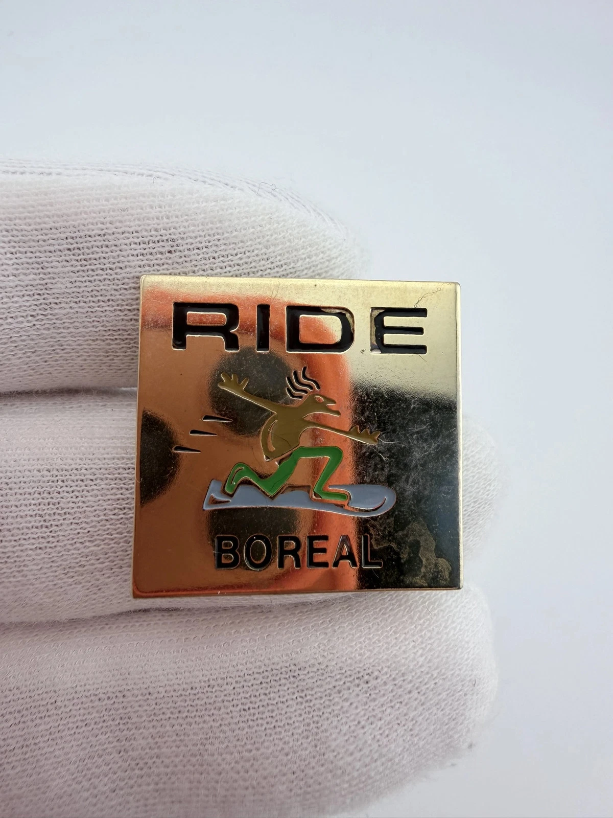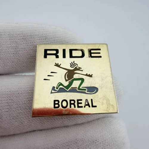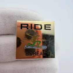 This pin has a square design with a gold tone finish and features a character riding a snowboard at the center. At the top it reads “Ride,” and at the bottom it says “Boreal.”