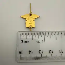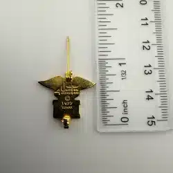 A 1977 lapel pin from Uniform Accessories featuring the caduceus symbol, a staff with two snakes wrapped around it, representing the nursing profession.