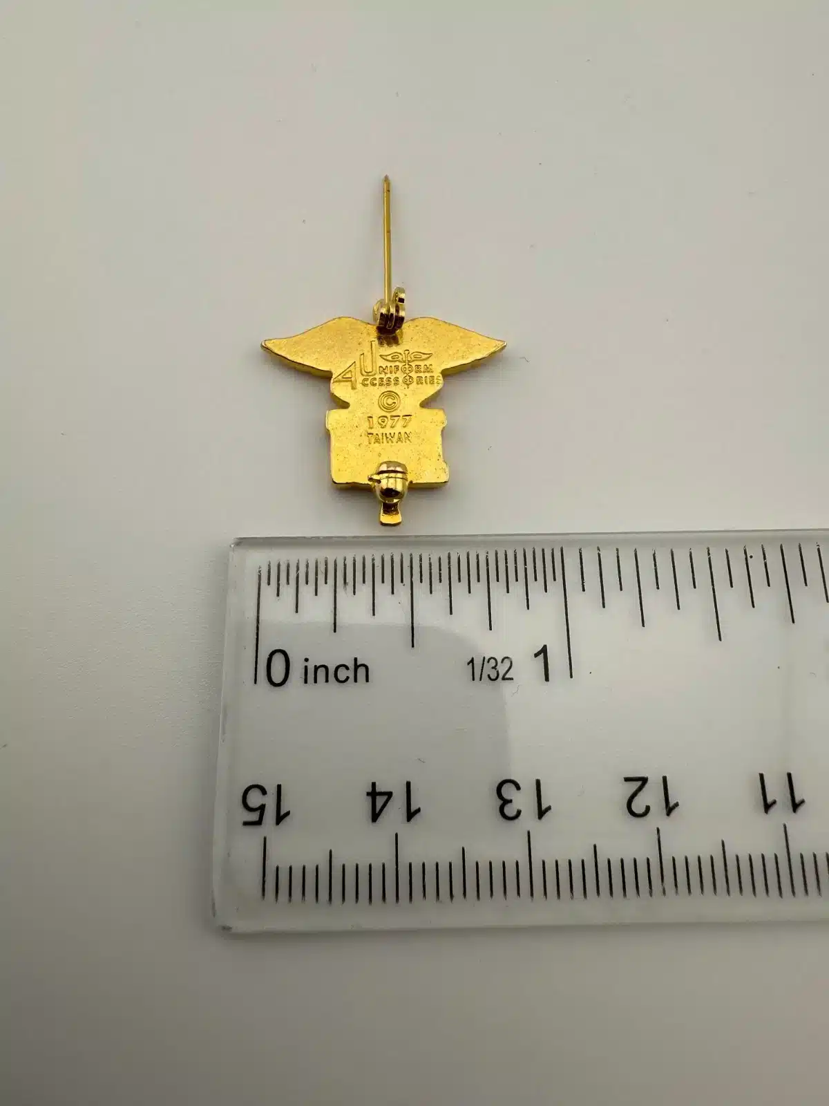 A 1977 lapel pin from Uniform Accessories featuring the caduceus symbol, a staff with two snakes wrapped around it, representing the nursing profession.