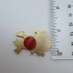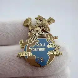 This lapel hat pin showcases a whimsical jester perched atop a globe, symbolizing the Royal Order of Jesters, a Masonic organization known for its playful spirit. The globe is intricately detailed with multiple cars, reflecting a connection to Detroit, Michigan, a city renowned for its automotive industry.