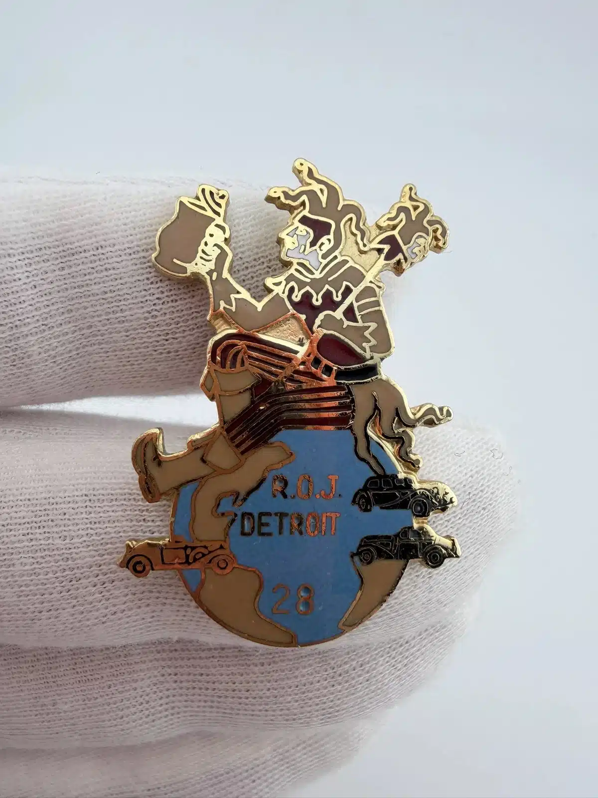 This lapel hat pin showcases a whimsical jester perched atop a globe, symbolizing the Royal Order of Jesters, a Masonic organization known for its playful spirit. The globe is intricately detailed with multiple cars, reflecting a connection to Detroit, Michigan, a city renowned for its automotive industry.