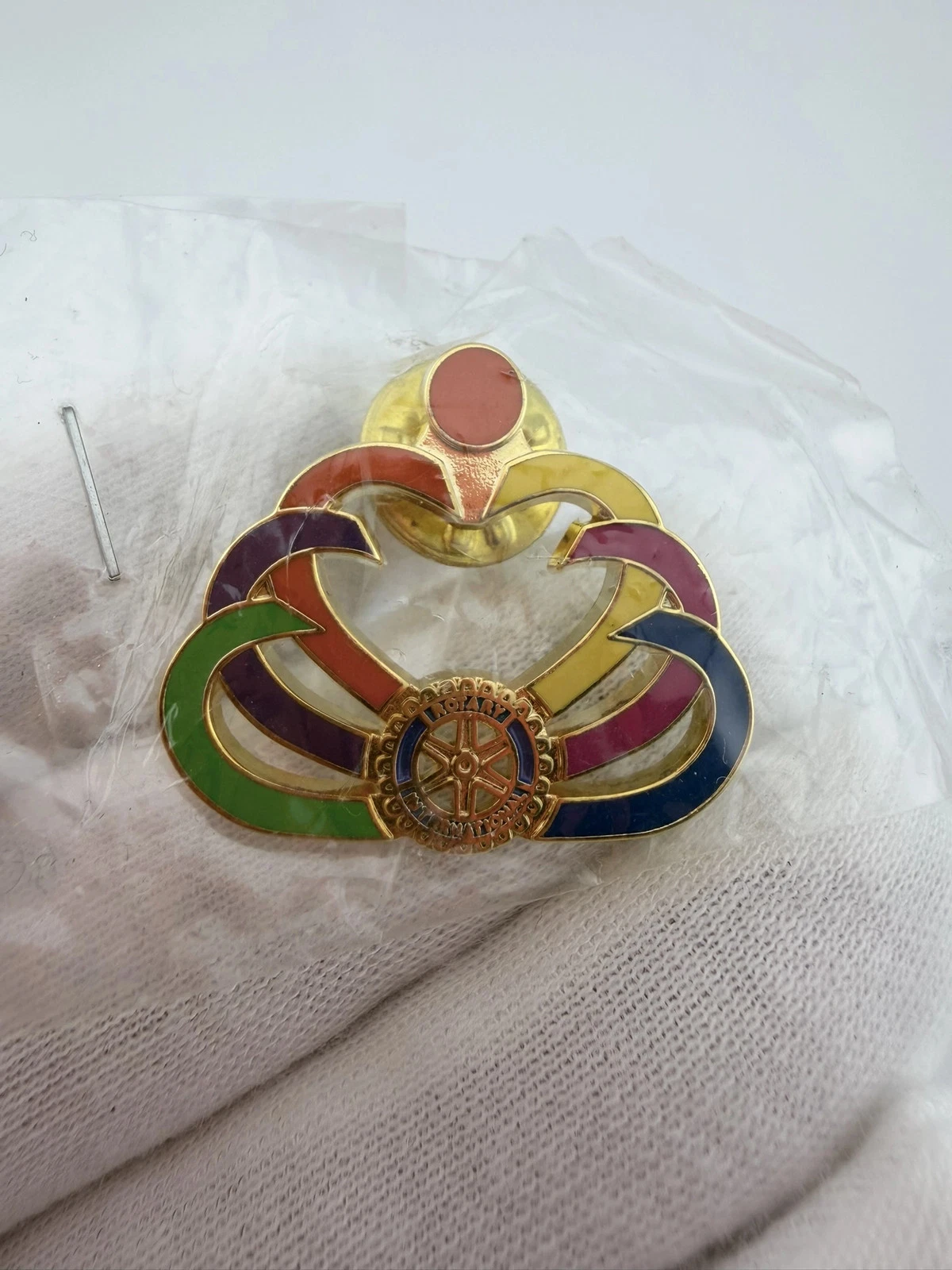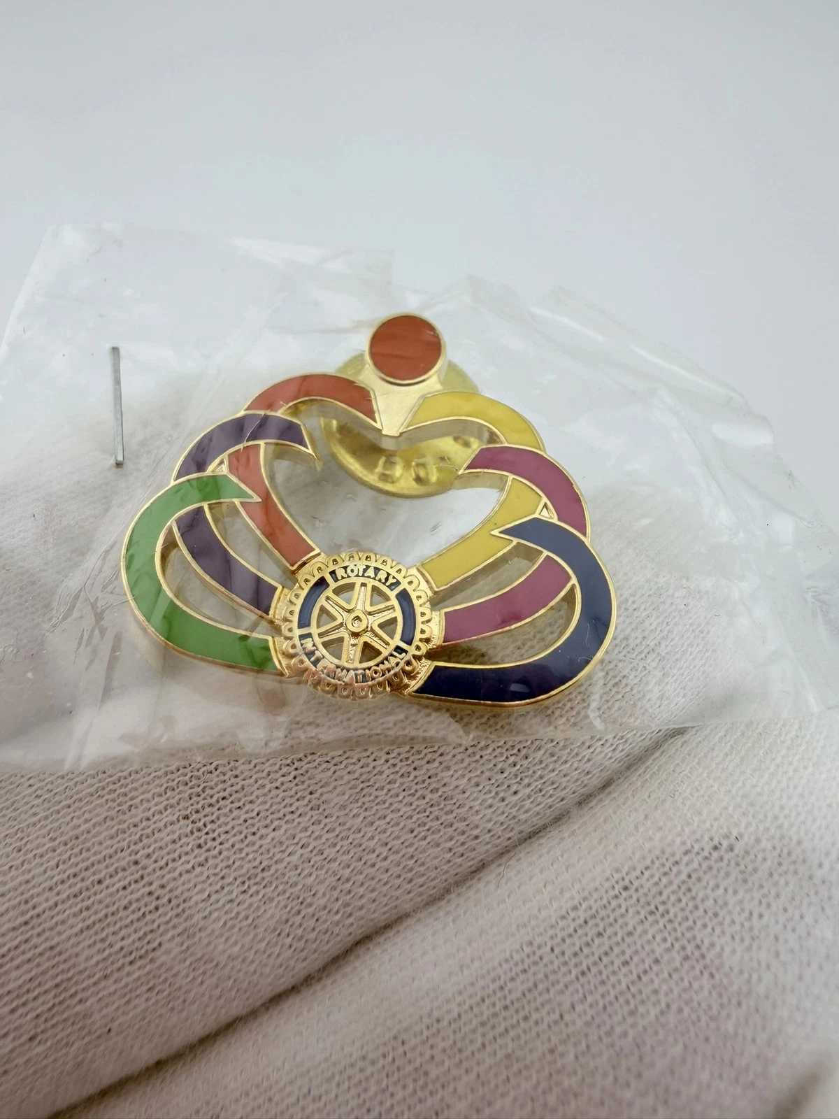 This pin features a design with multiple colored half heart shapes that come together toward the top. At the bottom is the Rotary International emblem.
