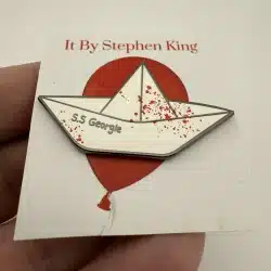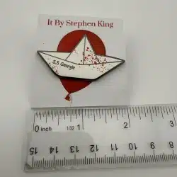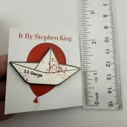 This enamel pin features a paper boat design, symbolizing the S.S. Georgie from Stephen King’s iconic horror novel ‘It’. The boat, associated with the character Georgie Denbrough, is rendered in a striking blood spattered red and white color scheme, capturing the essence of childhood innocence and the dark undertones of the story. Unsure if this is a fan pin or …