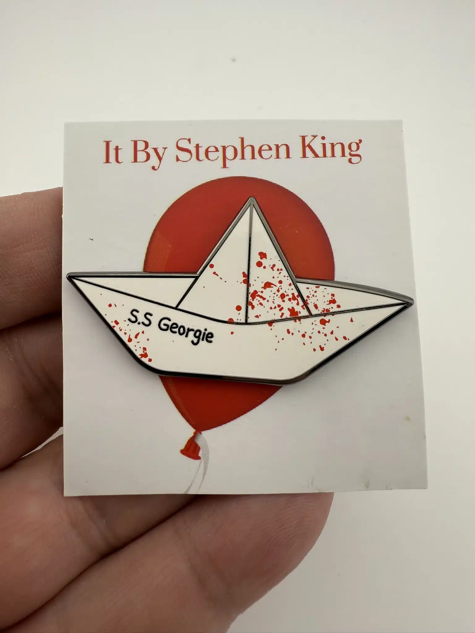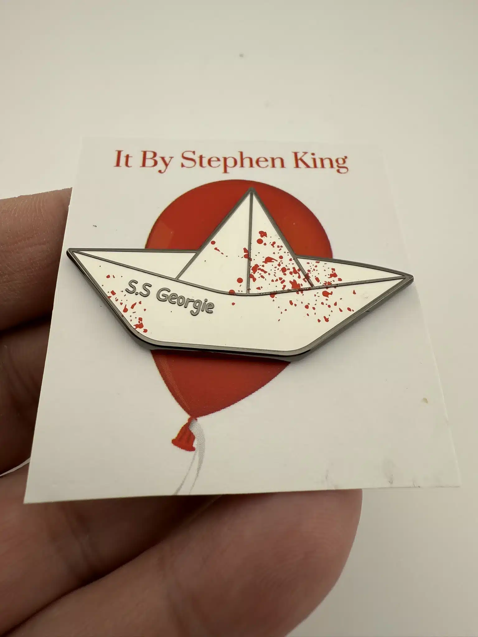 This enamel pin features a paper boat design, symbolizing the S.S. Georgie from Stephen King’s iconic horror novel ‘It’. The boat, associated with the character Georgie Denbrough, is rendered in a striking blood spattered red and white color scheme, capturing the essence of childhood innocence and the dark undertones of the story. Unsure if this is a fan pin or …