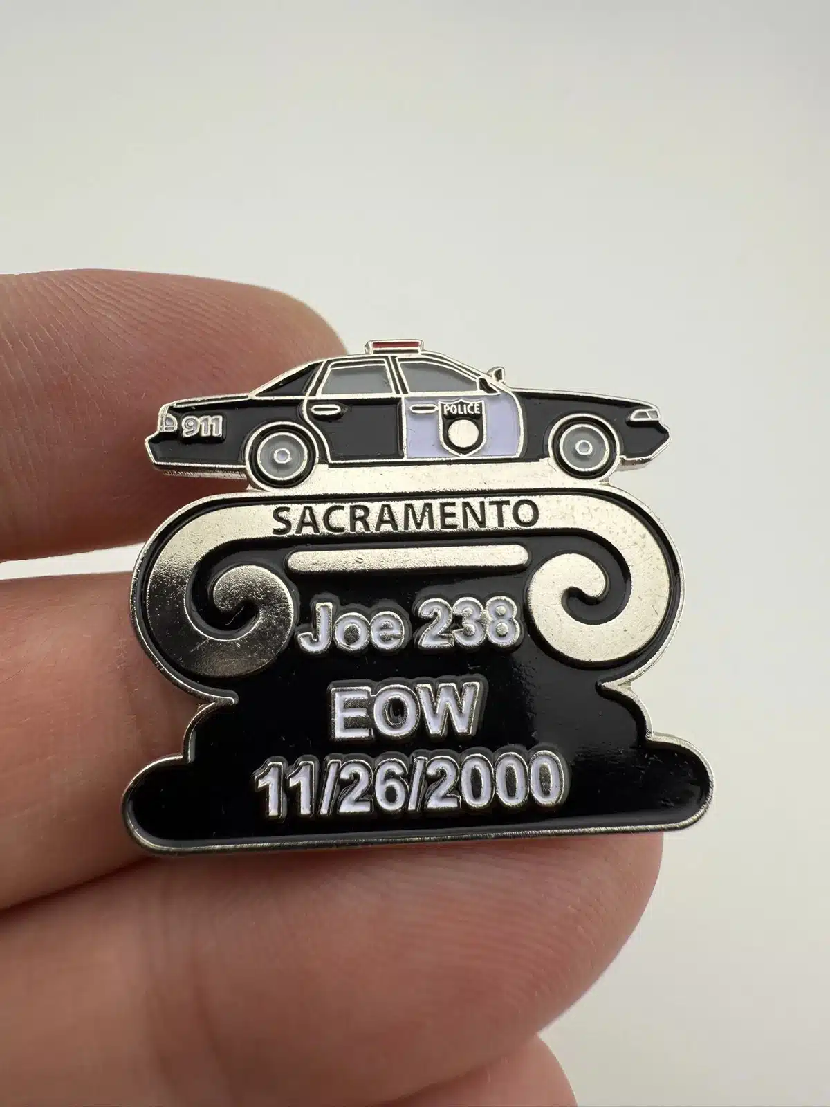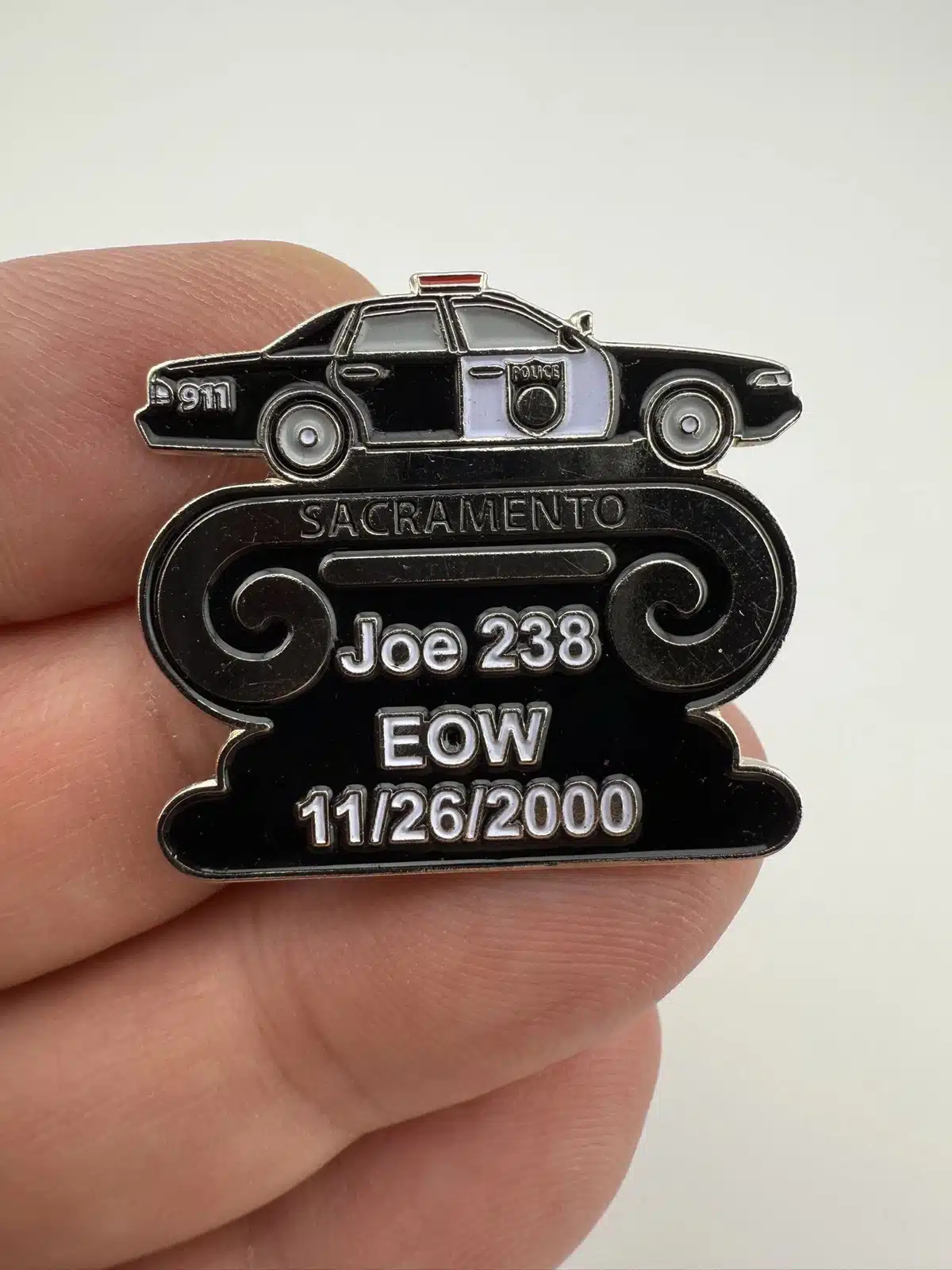 One of several pins I have honoring Sacramento Police Officer Joseph Joe Chairez who tragically passed away on duty from a brain aneurism. This particular pin features a police patrol car.