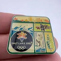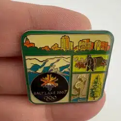 Salt Lake City 2002 Olympics Pin with Skyline, Animals, and more *scratch marks*
