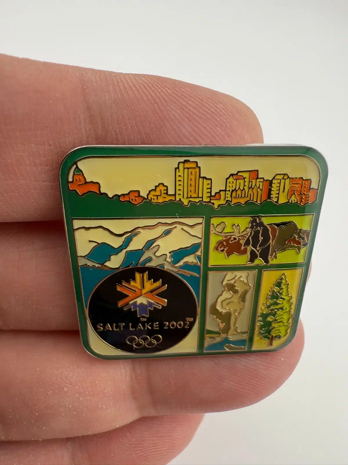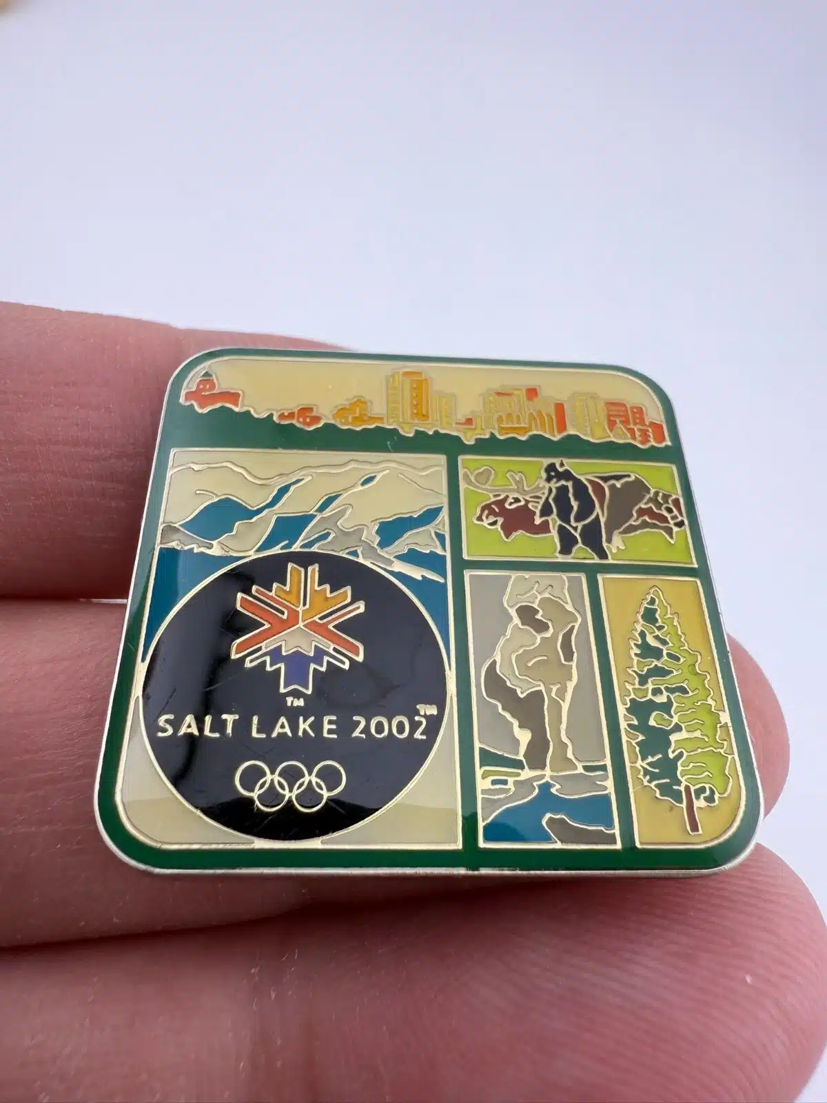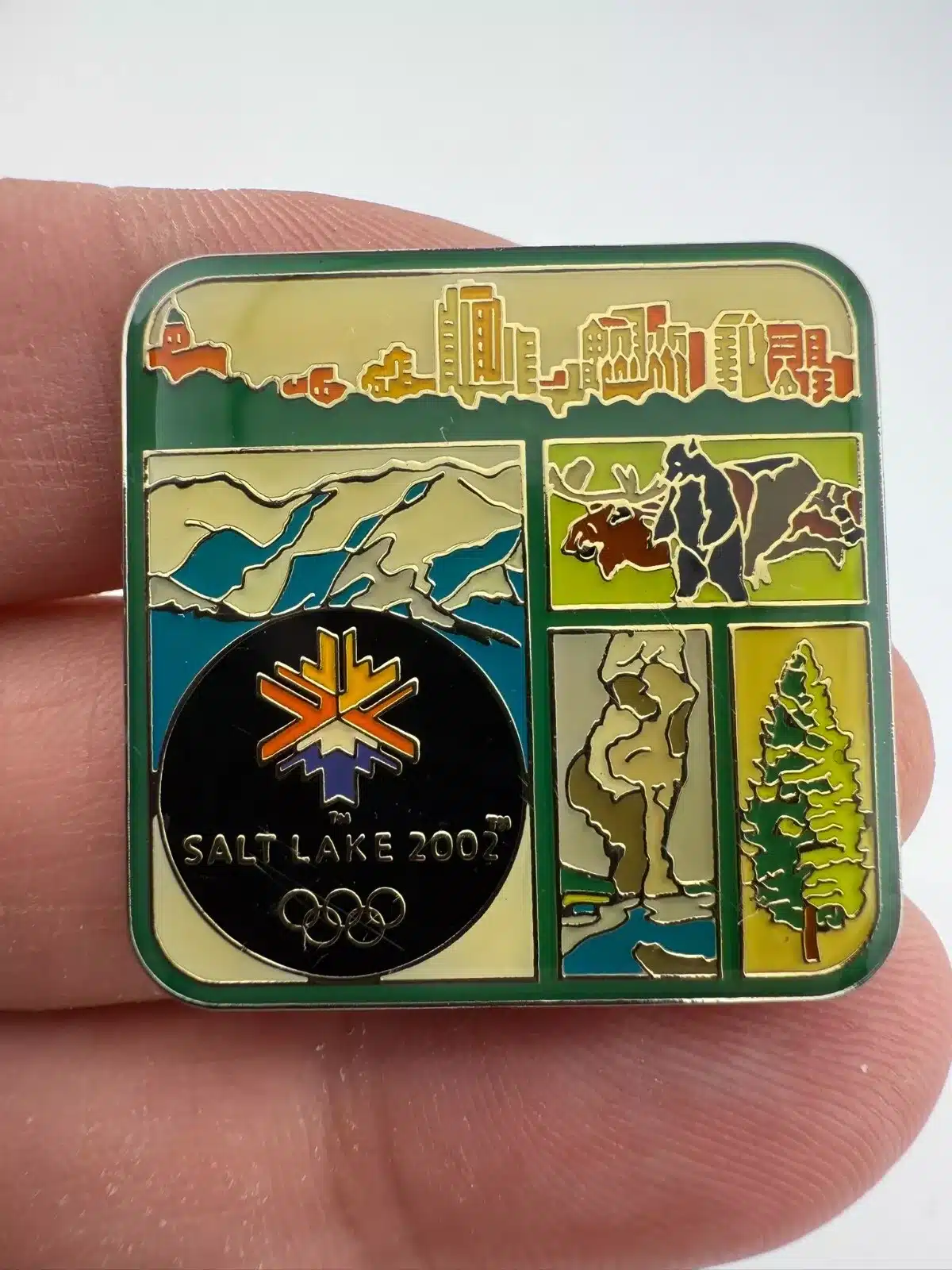 Salt Lake City 2002 Olympics Pin with Skyline, Animals, and more *scratch marks*