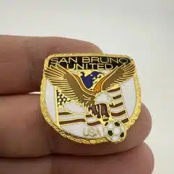 This San Bruno United Soccer pin features a unique design that incorporates the globe, an eagle, the United States flag, and a soccer ball, symbolizing the unity and spirit of the team.