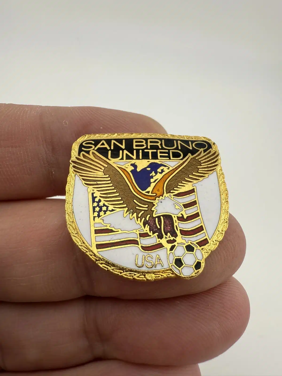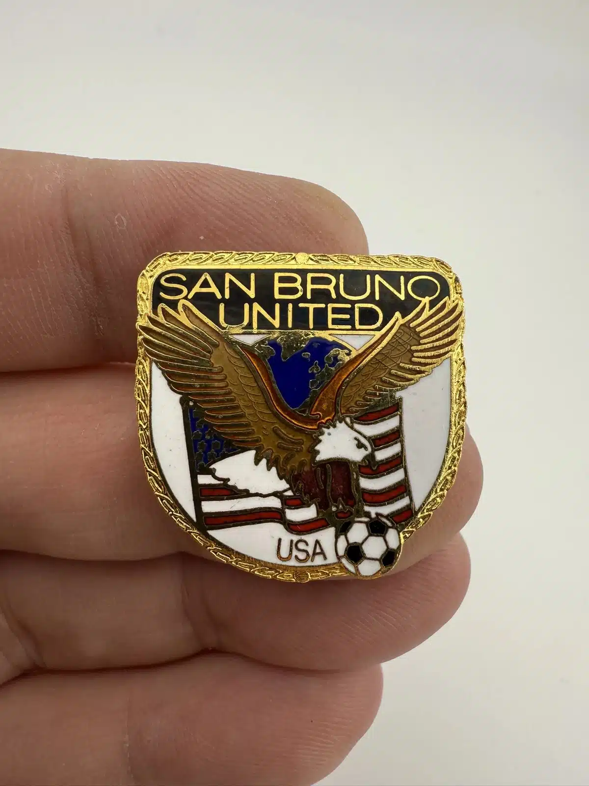 This San Bruno United Soccer pin features a unique design that incorporates the globe, an eagle, the United States flag, and a soccer ball, symbolizing the unity and spirit of the team.