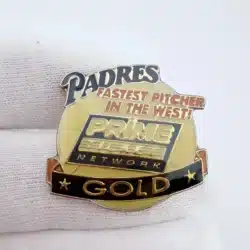 This collectible pin is shaped like a baseball, featuring the San Diego Padres’ logo alongside the Prime Ticket Network branding. The design celebrates the achievement of the fastest pitcher in the West, making it a notable piece for fans of both the team and the sport. At the bottom of a pin is a banner that reads ‘Gold.’