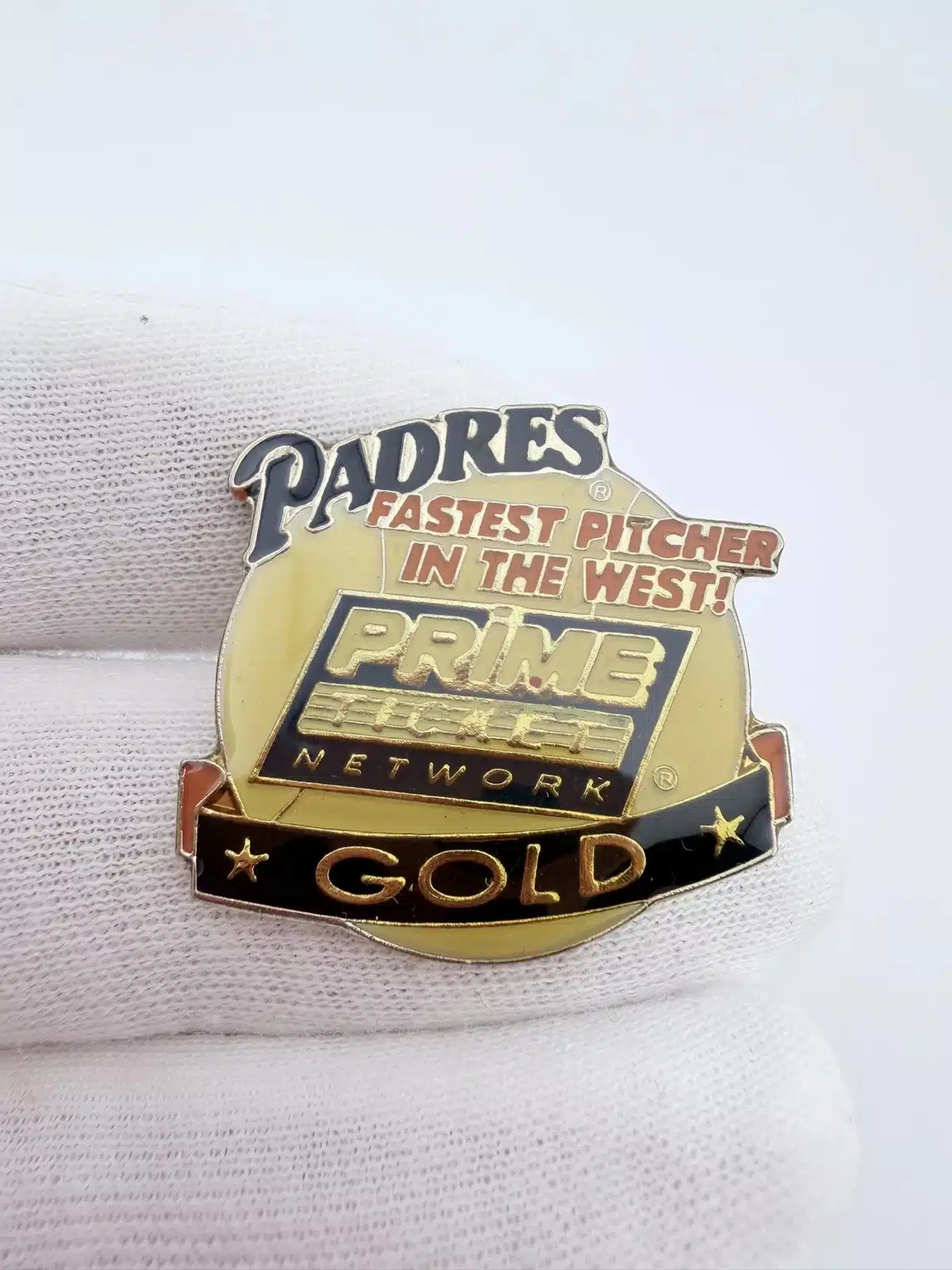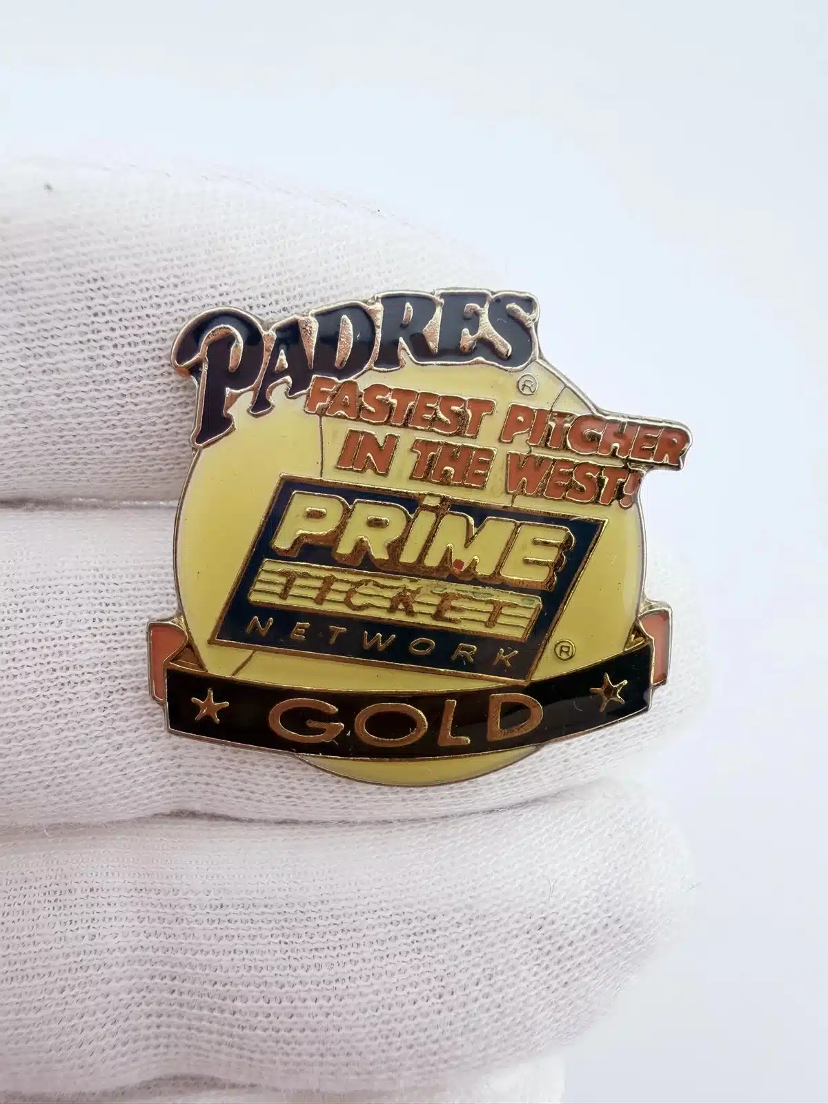 This collectible pin is shaped like a baseball, featuring the San Diego Padres’ logo alongside the Prime Ticket Network branding. The design celebrates the achievement of the fastest pitcher in the West, making it a notable piece for fans of both the team and the sport. At the bottom of a pin is a banner that reads ‘Gold.’