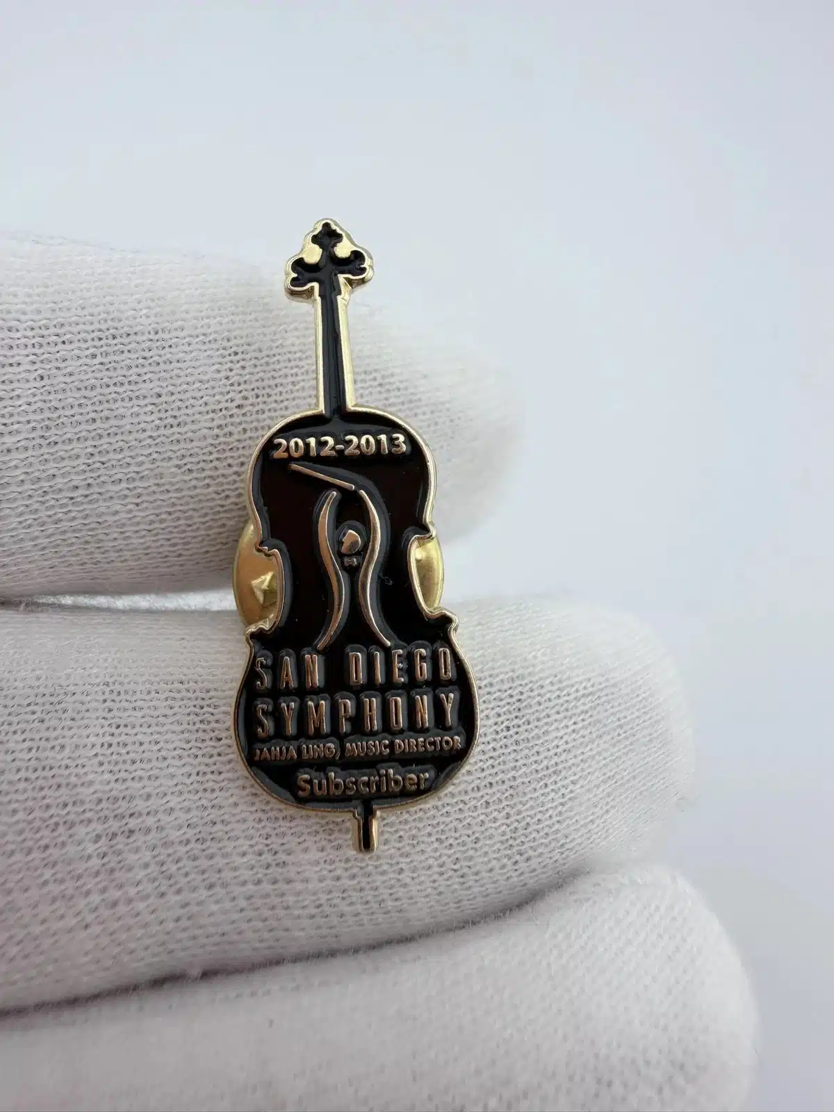 This pin is designed in the shape of a cello, featuring a sleek black finish that highlights its elegant contours. The inclusion of text on the pin signifies its connection to the San Diego Symphony’s 2012-2013 subscriber season, celebrating the art of music and performance.